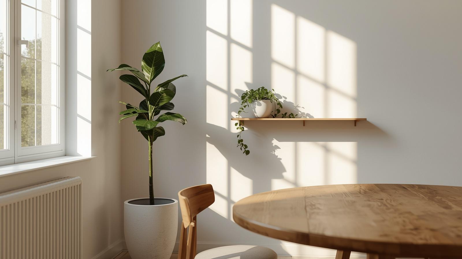 A few well-placed indoor plants bring life, color, and organic warmth to a tiny dining room without consuming meaningful floor space. Choose a tall slender plant like a fiddle leaf fig or snake plant for a corner, and add a small trailing pothos on a floating shelf or windowsill. Plants introduce a natural layer of visual interest that softens hard surfaces and architectural edges, making the room feel curated, alive, and far more inviting than bare walls and furniture alone.