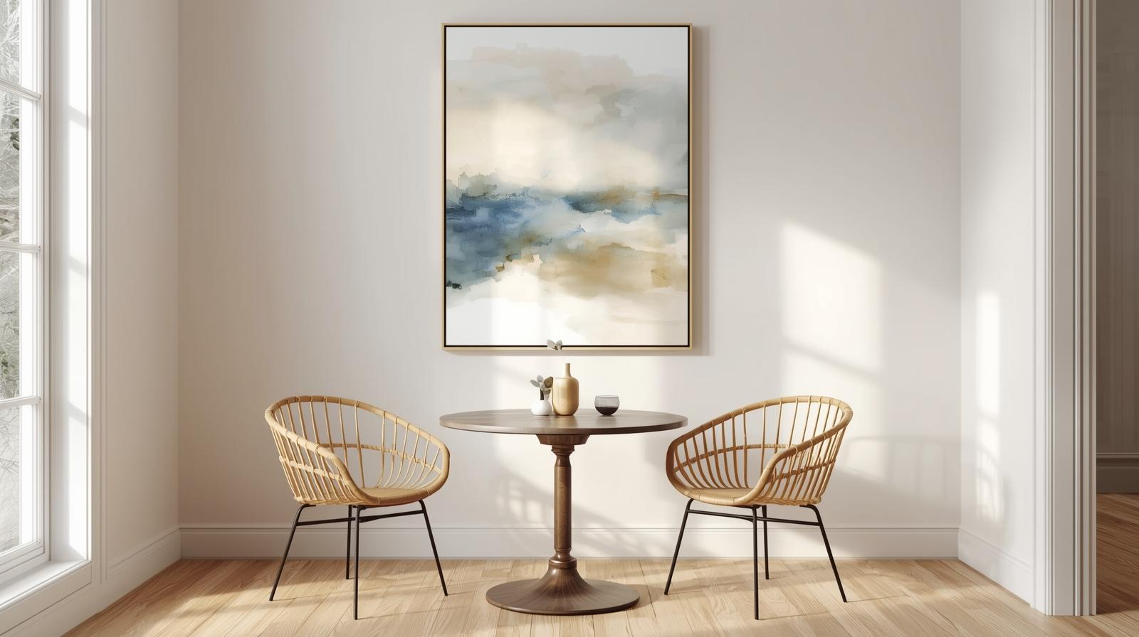In a small dining room, the instinct is to choose small artwork — but this actually makes the space feel more cramped and unresolved. Instead, hang one large-scale piece that fills the majority of the wall. A single oversized print, canvas, or framed photograph creates a gallery-quality focal point that gives the room confidence and presence. Choose artwork with an airy composition — open landscapes, abstract washes, or minimal line drawings — to keep the mood light and spacious.