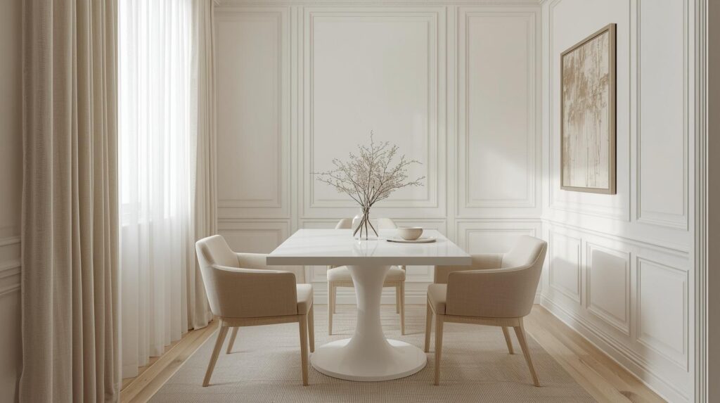 Dressing a tiny dining room in a single cohesive color palette — walls, furniture, and textiles all within the same tonal family — removes visual boundaries and makes the space feel seamlessly expansive. Try an all-white scheme with warm undertones, a full greige palette, or soft sage carried across every surface. When the eye cannot detect where one element ends and another begins, the perception of space increases naturally. Add depth through texture — linen, wood grain, matte ceramic — rather than contrasting color.