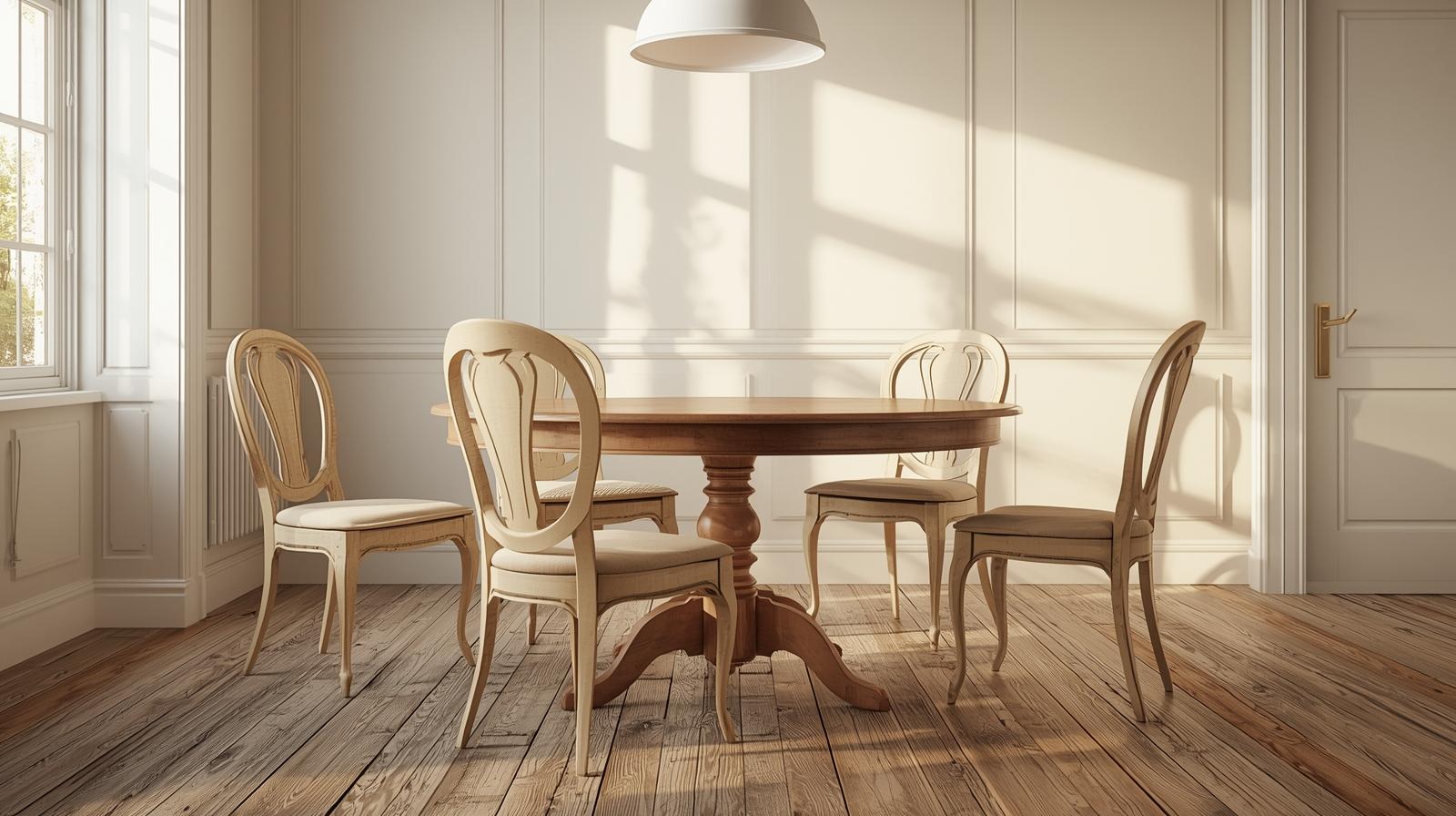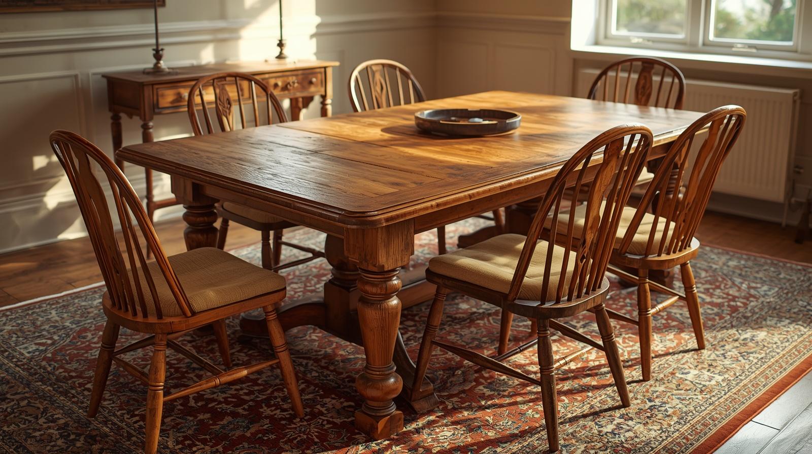 An antique wooden dining table with visible grain, natural patina, and honest wear tells a story no new furniture ever could. Look for pieces in solid oak, walnut, or mahogany with turned legs or trestle bases that speak to a bygone era of craftsmanship. The aged warmth of the wood anchors the entire dining room with authenticity and character. Style it simply with linen napkins and ceramic tableware to let the table’s natural beauty remain the undisputed focal point.