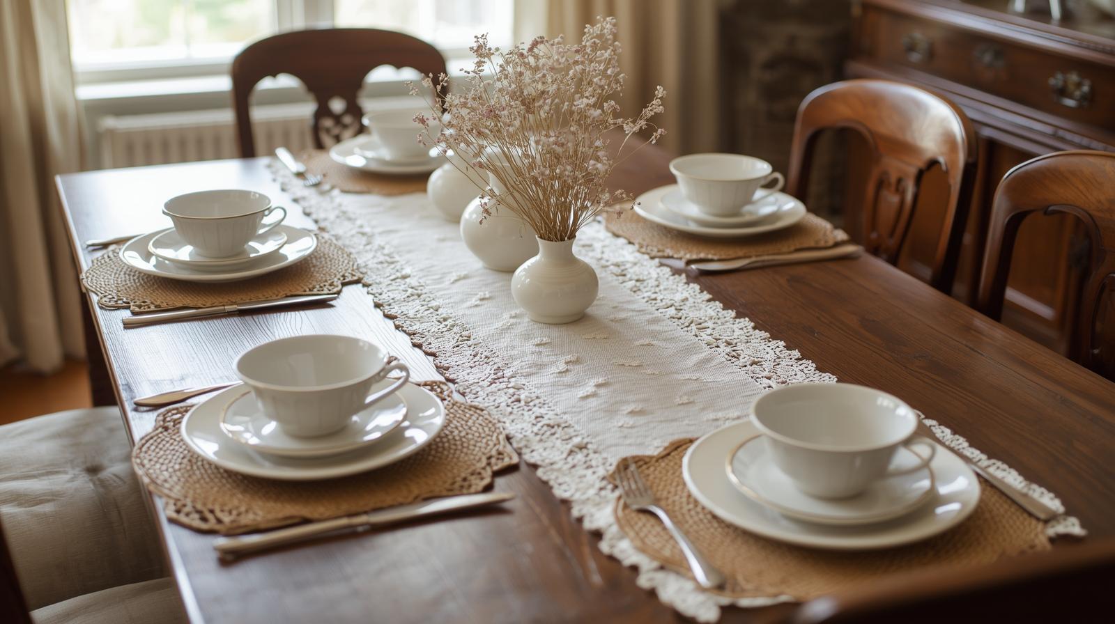 Dressing the dining table with vintage-style lace or hand-embroidered linen introduces delicate craftsmanship and heirloom quality that transforms even a simple meal into a considered occasion. A lace table runner down the center of a dark wood table creates beautiful contrast between the intricate white pattern and the rich wood tone beneath. Layer embroidered placemats and linen napkins tied with twine or ribbon to build a fully styled tablescape rooted in old-world domestic elegance.