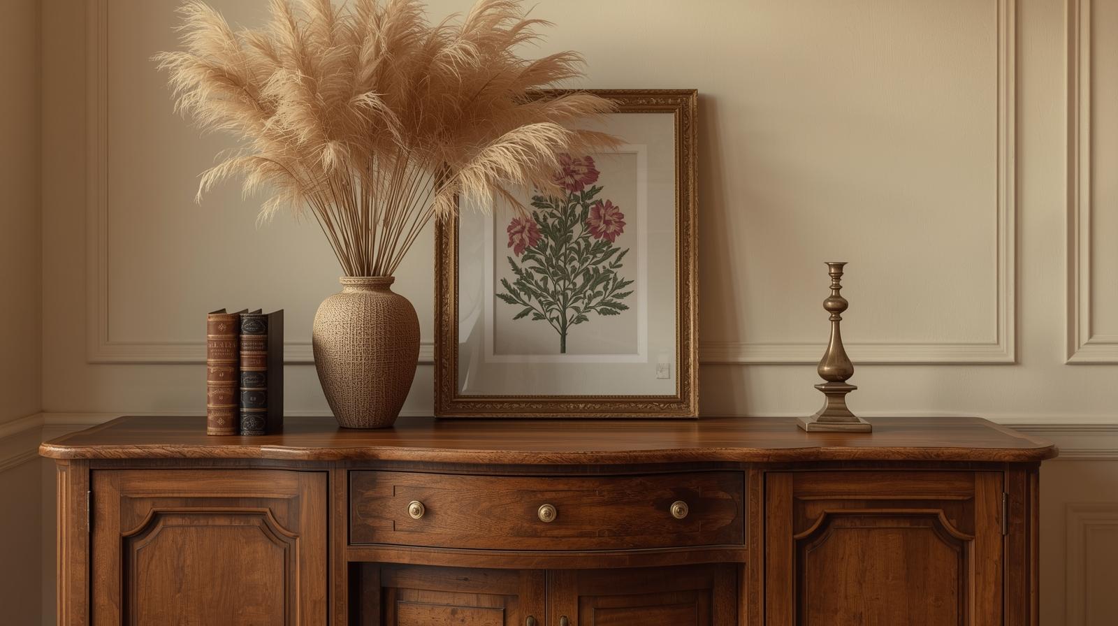 A vintage sideboard styled with a personally collected arrangement of objects brings irreplaceable depth and narrative to the dining room. Group items of varying heights — a tall ceramic vase, a stack of antique books, a small framed photograph, a brass candlestick — following the classic rule of odd numbers for visual balance. The layered arrangement should feel discovered rather than decorated, as though each object arrived at the sideboard from a different chapter of a well-lived life.