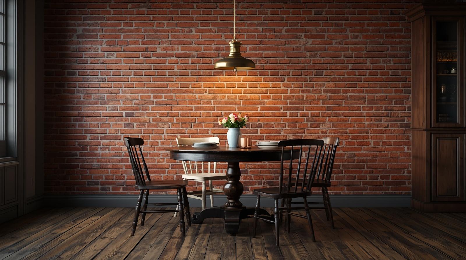 An exposed brick wall in the dining room provides an irreplaceable vintage backdrop that no wallpaper or paint finish can authentically replicate. The raw texture, natural color variation, and aged imperfection of old brick brings industrial warmth and historical character to the space. Style in front of it simply — let the brick do the visual work. A vintage pendant light, a simple wooden table, and mismatched chairs in front of exposed brick creates a dining room atmosphere of effortless, timeworn beauty.