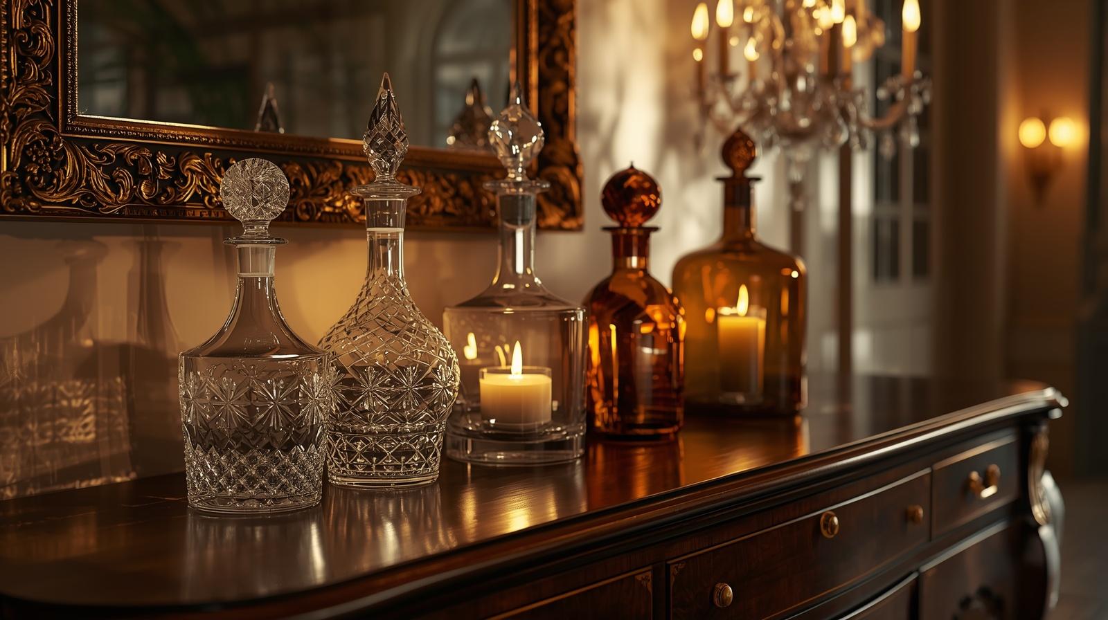 A collection of vintage glass decanters arranged on the dining table or sideboard adds a glittering, celebratory quality to the room that speaks directly to a culture of gracious, unhurried entertaining. Cut crystal, pressed glass, and hand-blown forms in clear, amber, or deep green catch light beautifully at every angle. Group three to five decanters of varying heights and silhouettes together for maximum visual impact. Even when empty, they function as sculptural objects of considerable elegance and charm.
