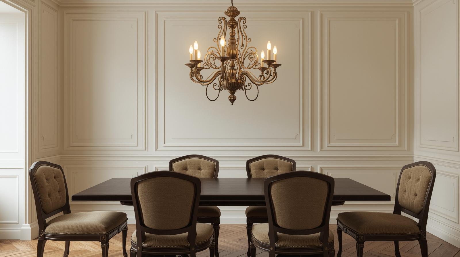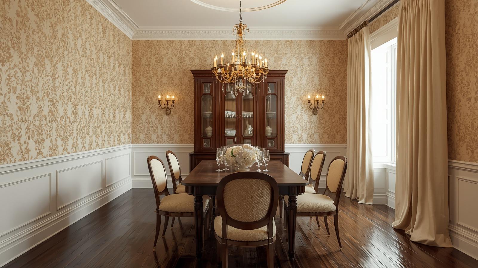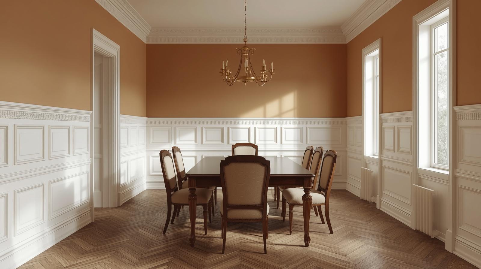 Installing wainscoting with decorative molding on the lower half of the dining room walls adds immediate architectural gravitas and period-appropriate character to the space. Painted in crisp white, warm cream, or soft sage, the paneled lower wall creates a visual dividing line that makes ceilings feel taller and rooms feel more formally designed. The raised molding details catch light and shadow throughout the day, adding three-dimensional depth that transforms a plain box room into something with genuine historical presence.