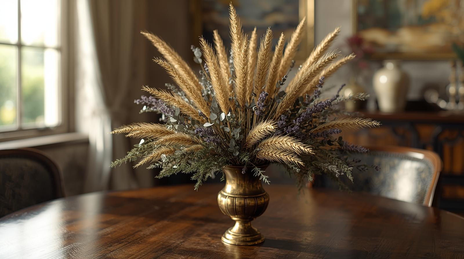 A generous dried floral arrangement as a dining table centerpiece brings muted, romantic beauty and organic texture to the vintage dining room without the maintenance of fresh flowers. Combine dried pampas grass, wheat stalks, preserved eucalyptus, dried lavender, and bleached botanicals in a vintage ceramic or aged brass vase. The neutral, sun-bleached palette of dried florals complements vintage wood tones and aged textiles beautifully, creating a centerpiece that feels gathered from the countryside and entirely, timelessly beautiful.