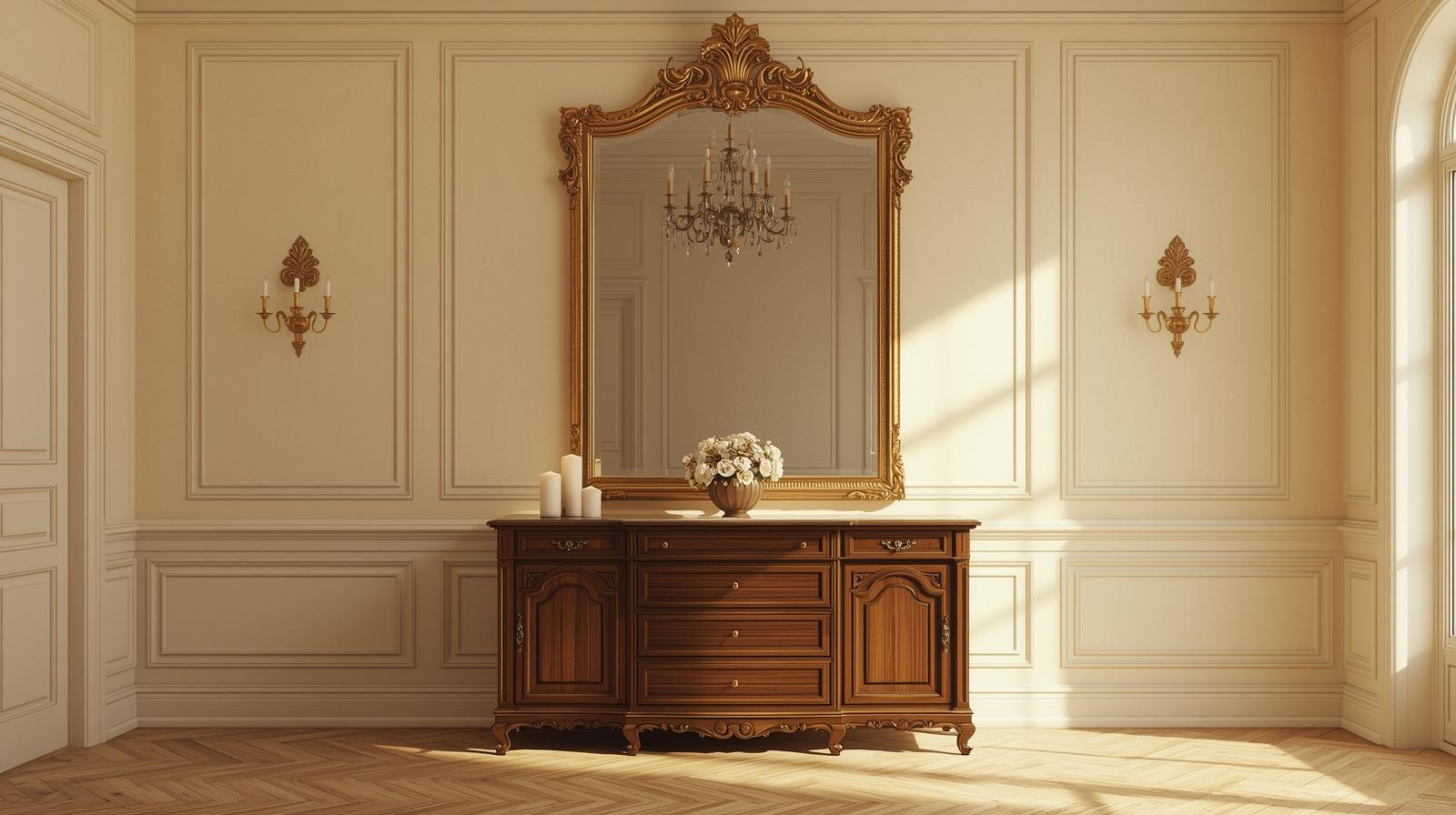 A large ornate mirror with a gilded or gold-leafed frame mounted above a vintage sideboard is one of the most classically elegant gestures in dining room design. The elaborate carved frame references European antique styling while the reflective surface brightens the room and adds visual depth. Choose a frame with scrollwork, floral motifs, or distressed gold finish for authentic vintage character. Style the sideboard beneath with candles, a floral arrangement, and a few meaningful ceramic objects.