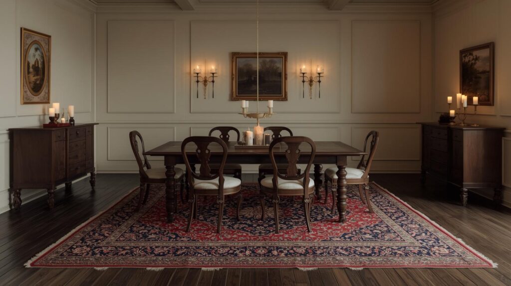 Laying a vintage Persian or Oriental rug beneath the dining table instantly transforms the room’s atmosphere from ordinary to richly layered and historically resonant. The complex patterns and jewel-toned colors — deep ruby, sapphire, amber, and ivory — bring warmth and visual complexity to the floor plane, grounding the furniture arrangement with a sense of heritage and permanence. Choose a rug large enough that all chair legs remain on it even when pulled out, maintaining a cohesive, intentional look.