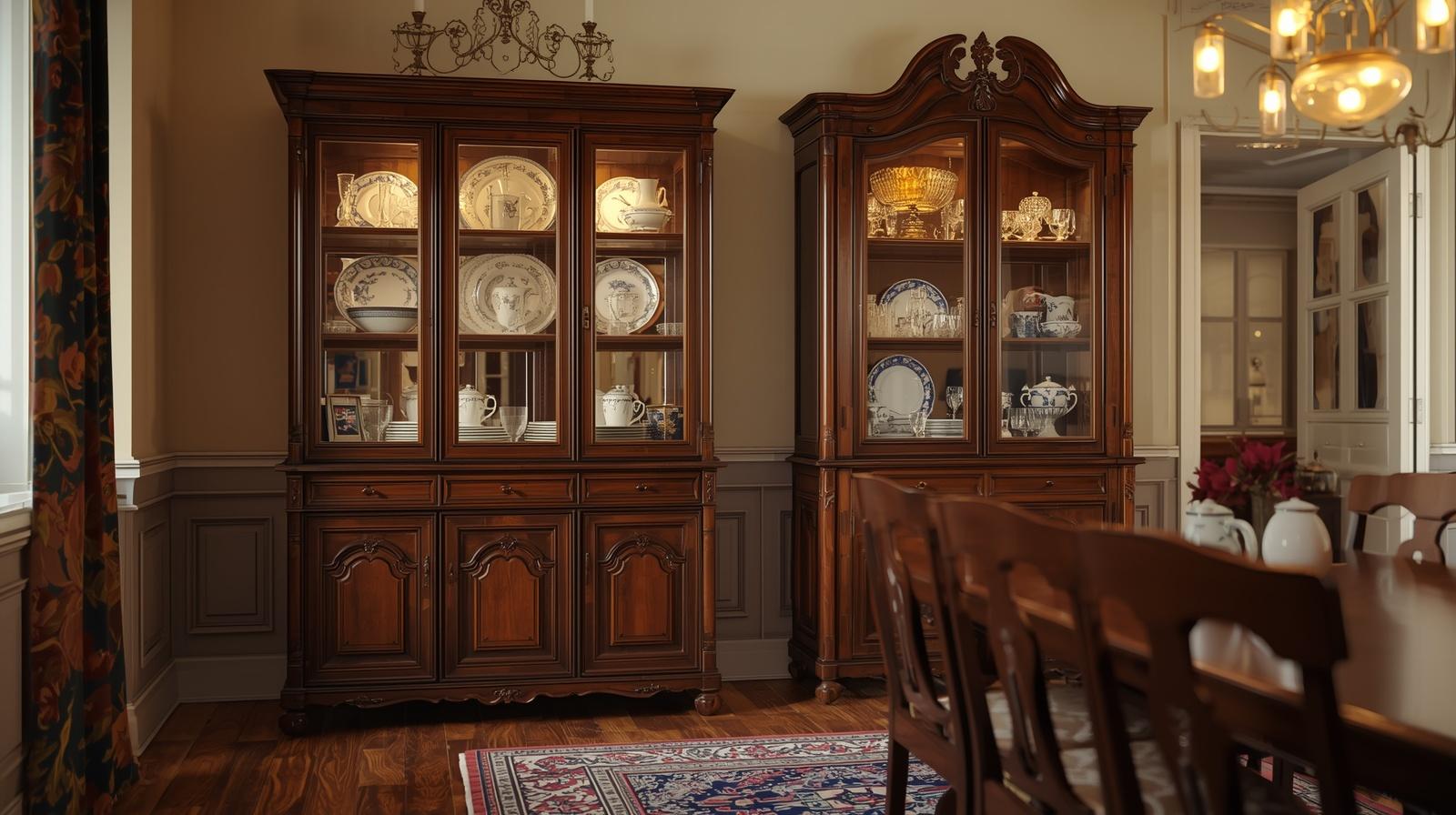 A tall antique china cabinet standing against the dining room wall brings both function and old-world grandeur to the space. Glass-fronted doors reveal carefully arranged vintage china, crystal glassware, and decorative ceramics inside, turning everyday tableware into a curated display. Choose a cabinet in dark mahogany, walnut, or painted in a soft distressed finish. The height of the piece draws the eye upward while its contents add layers of color, reflection, and personal history to the room.