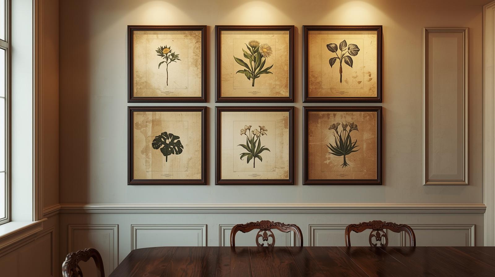 A series of vintage botanical prints — the kind found in 19th century scientific illustration books featuring detailed drawings of plants, flowers, and herbs — grouped together on the dining room wall creates a scholarly, collected atmosphere with quiet sophistication. Frame them in identical dark wood, aged brass, or black frames for cohesion. The muted ink tones of vintage botanicals complement almost any color palette and bring an intellectual, curated quality to the room that feels genuinely timeless