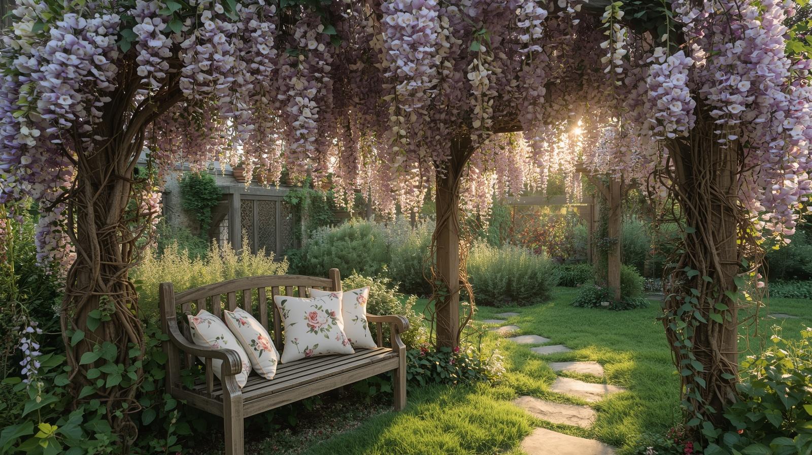 A simple timber pergola draped in wisteria, roses, or jasmine positioned over a garden seat or small outdoor table creates the most coveted and romantically perfect resting place the cottage garden can offer. The dappled shade beneath a flowering pergola — where sunlight filters through a canopy of blooms and leaves, fragrance drifts on the breeze, and the sound of bees fills the air — represents the very pinnacle of outdoor living beauty. Choose a bench in weathered teak, painted iron, or rustic reclaimed timber and add a scatter of cushions in soft florals or stripes for comfort.