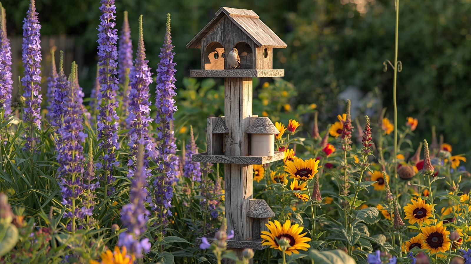 A dedicated bird feeding station positioned within the cottage garden among the flower borders transforms the garden into a living wildlife sanctuary of considerable charm and daily joy. Choose a classic timber or painted metal station with multiple feeding points — a seed feeder, a fat ball holder, a platform for scattered grain — and position it where it can be observed easily from the house. Surround the base with sunflower, teasel, and verbena bonariensis for plants whose seed heads provide additional natural food sources and whose tall forms frame the feeding station with genuine cottage garden beauty.