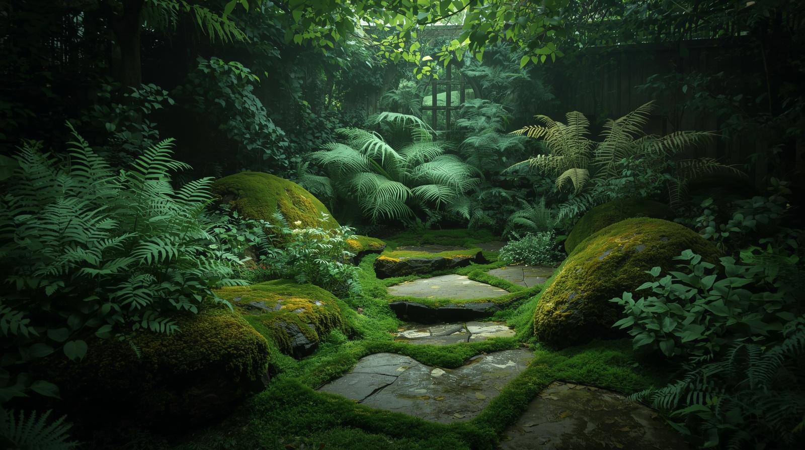 A series of large irregular stepping stones set through a shaded, mossy area of the cottage garden creates a secret, woodland inspired pathway of extraordinary atmospheric beauty and quiet mystery. Allow moss to colonise the stone surfaces completely and encourage ferns, hostas, astilbes, and wood anemones to establish thickly on either side. The deep shade, soft green moss, and delicate woodland planting create a garden microclimate that feels entirely separate from the sunlit borders beyond — a hushed, enchanted corner of cool green beauty and genuine restorative tranquility.