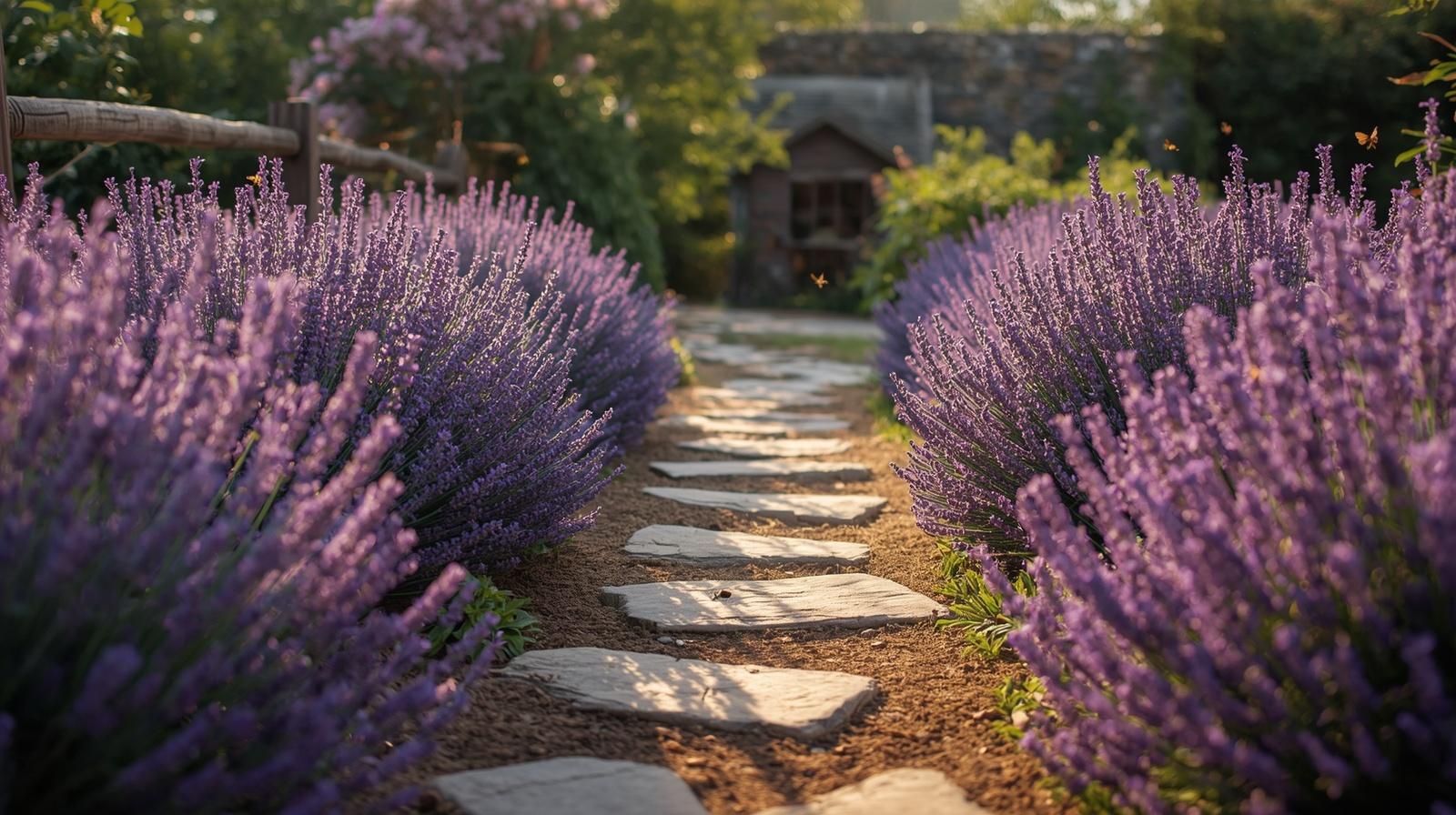 A narrow stone path edged generously on both sides with billowing lavender plants creates one of the most sensory and visually enchanting walkways available in cottage garden design. As the soft purple flower spikes rise above the path edges in early summer the effect is of walking through a living corridor of color, fragrance, and sound — the constant gentle hum of visiting bees completing the atmosphere with an irreplaceable natural soundtrack. Choose English lavender for its classic upright form and exceptional fragrance and allow plants to spill naturally onto the stone for a fully relaxed cottage effect.