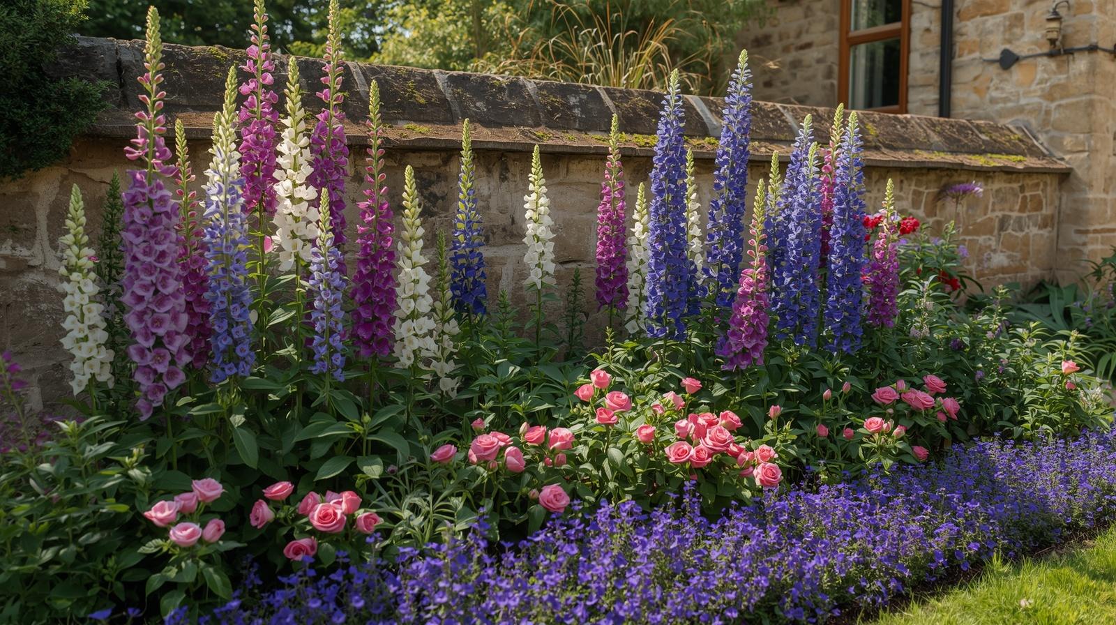 A cottage garden border planted predominantly with the tall, spire forming flowers of foxgloves and delphiniums creates a vertical drama and romantic abundance that is the very essence of the English cottage garden tradition at its most glorious and generous. The towering purple, pink, white, and blue flower spikes rise to impressive heights against fences, walls, or hedges and create a backdrop of extraordinary color and movement when caught by the breeze. Interplant with roses, geraniums, and catmint at medium height and low growing violas at the front for a fully layered border of complete cottage perfection.