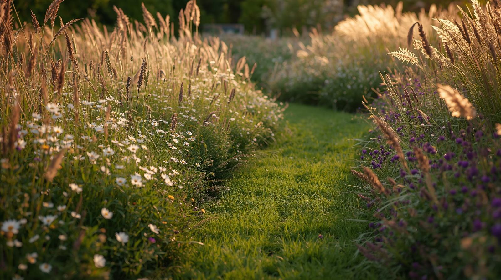 A narrow mown grass path winding informally through areas of taller meadow style planting creates a sense of gentle exploration and natural discovery that is one of the most enchanting qualities a cottage garden can possess. The contrast between the close mown grass of the path and the tall, flowering informality of the meadow planting on either side creates a journey through the garden that reveals itself gradually around each gentle curve. Plant the meadow areas with ox eye daisies, field scabious, knapweed, and grasses for a naturalistic tapestry of seasonal color and extraordinary wildlife value.
