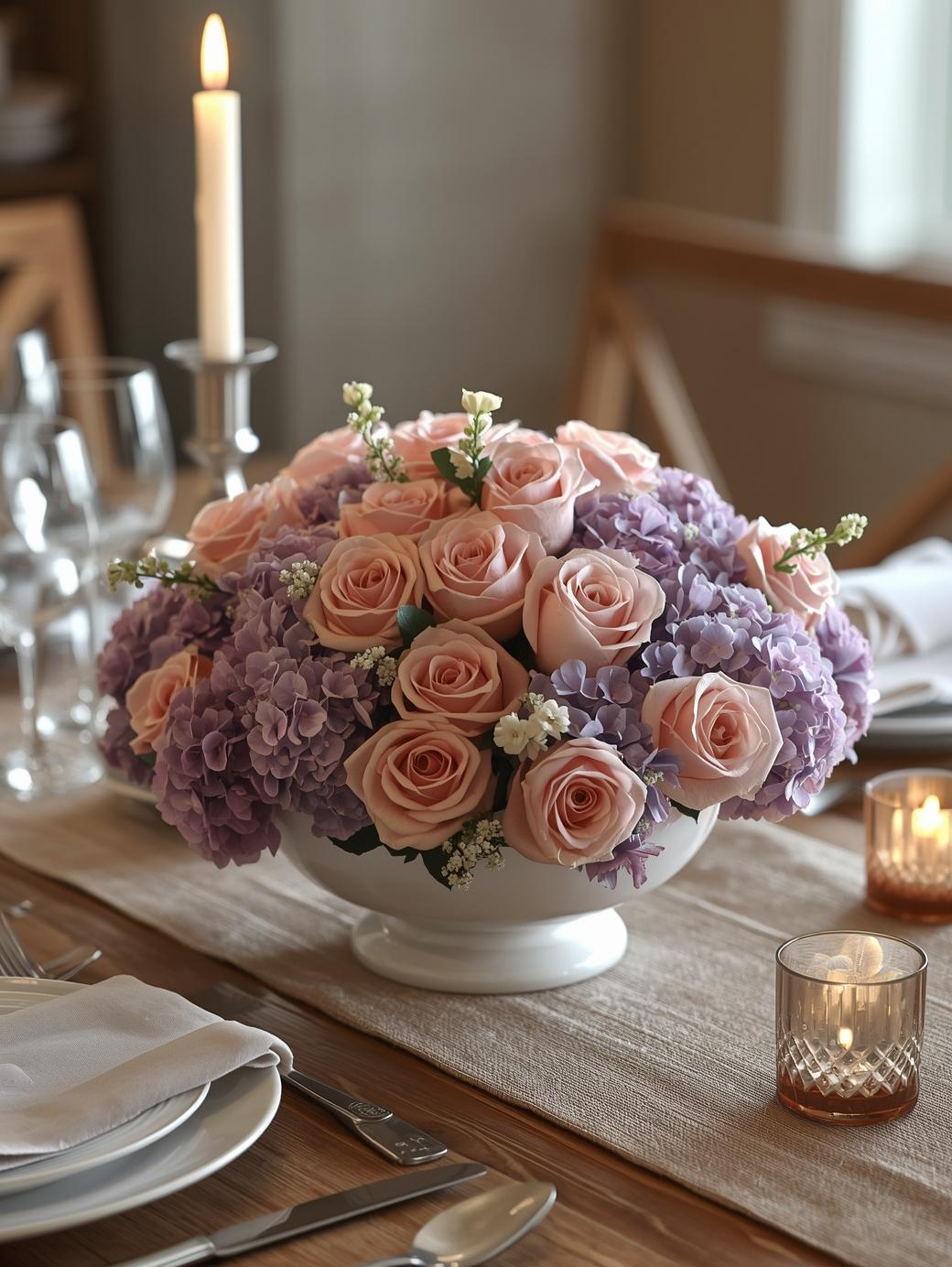 A low, wide bowl filled with flowers creates a lush, abundant centerpiece that does not block conversation across the table. Use a shallow ceramic or wooden bowl and arrange compact blooms like garden roses, hydrangeas, or dahlias tightly together. Add a few floating candles around the bowl for an evening dinner setting. Low flower centerpieces are especially popular for dining tables because they keep sightlines open while still looking beautifully styled.