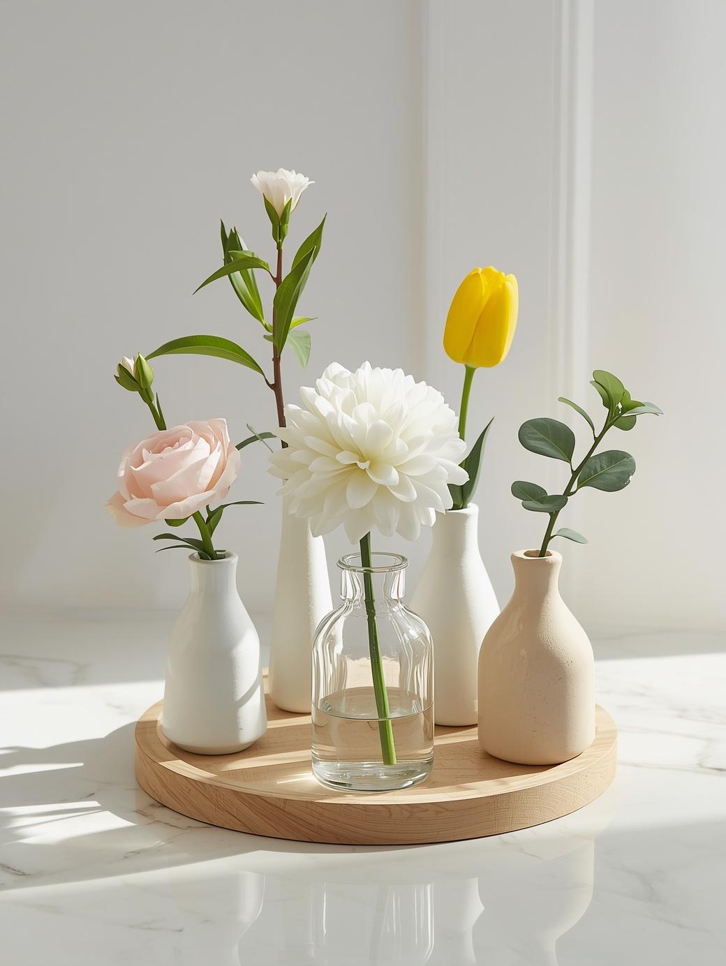 A cluster of small bud vases each holding a single flower stem is one of the most stylish and effortless centerpiece ideas. Use three to five bud vases of slightly different shapes and heights, all in matching white, clear glass, or earthy tones. Place one stem in each: a rose, a ranunculus, a tulip, a sprig of eucalyptus. Group them closely together on a tray or wooden board for a curated, florist-inspired display.