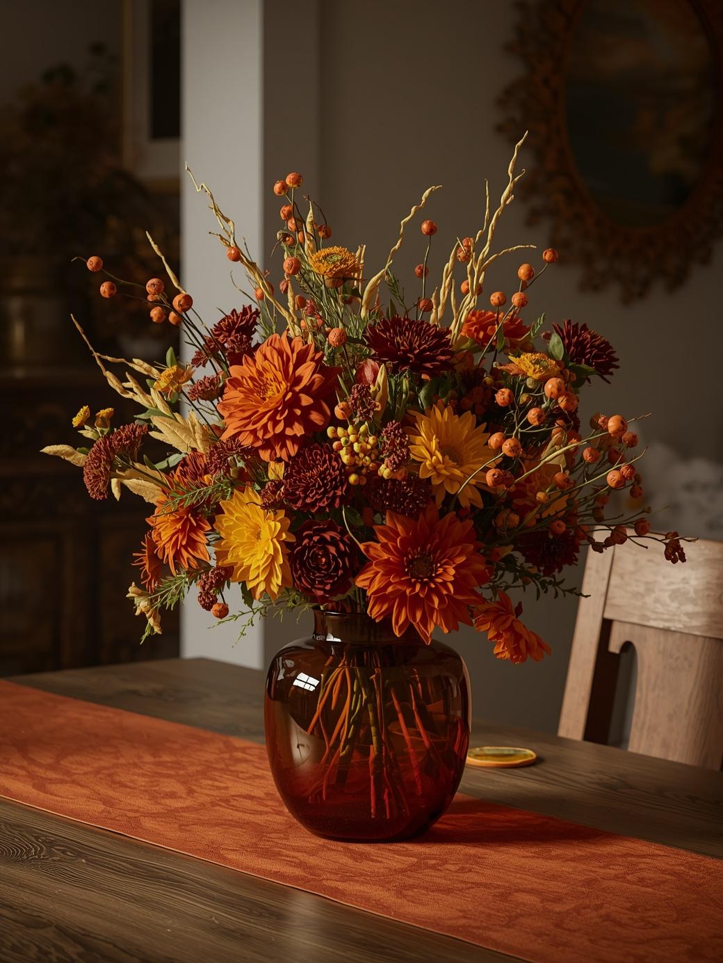 An autumn-inspired centerpiece combines the rich colors of the season, deep oranges, burgundy, rust, and warm gold, for a cozy, harvest-inspired look. Mix chrysanthemums, dahlias, and marigolds with sprigs of rosehip berries, dried orange slices, and cinnamon sticks. Arrange everything in a wide mouth amber glass vase or a ceramic pot. This is one of the most festive and warmly styled flower centerpiece ideas for the autumn and holiday season.