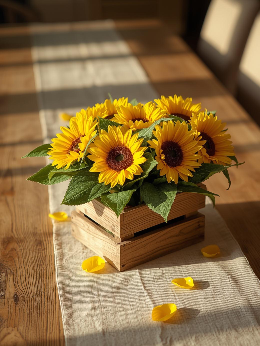 A wooden box or crate filled with tall cheerful sunflowers makes one of the most joyful and eye-catching centerpieces for a farmhouse, rustic, or casual home. Line the box with a glass jar or plastic liner to hold water, then arrange five to seven sunflowers tightly together with some green leaves. The contrast of the bright yellow blooms against the rustic wood is instantly striking. This centerpiece brings sunshine and warmth to any table indoors or outdoors.