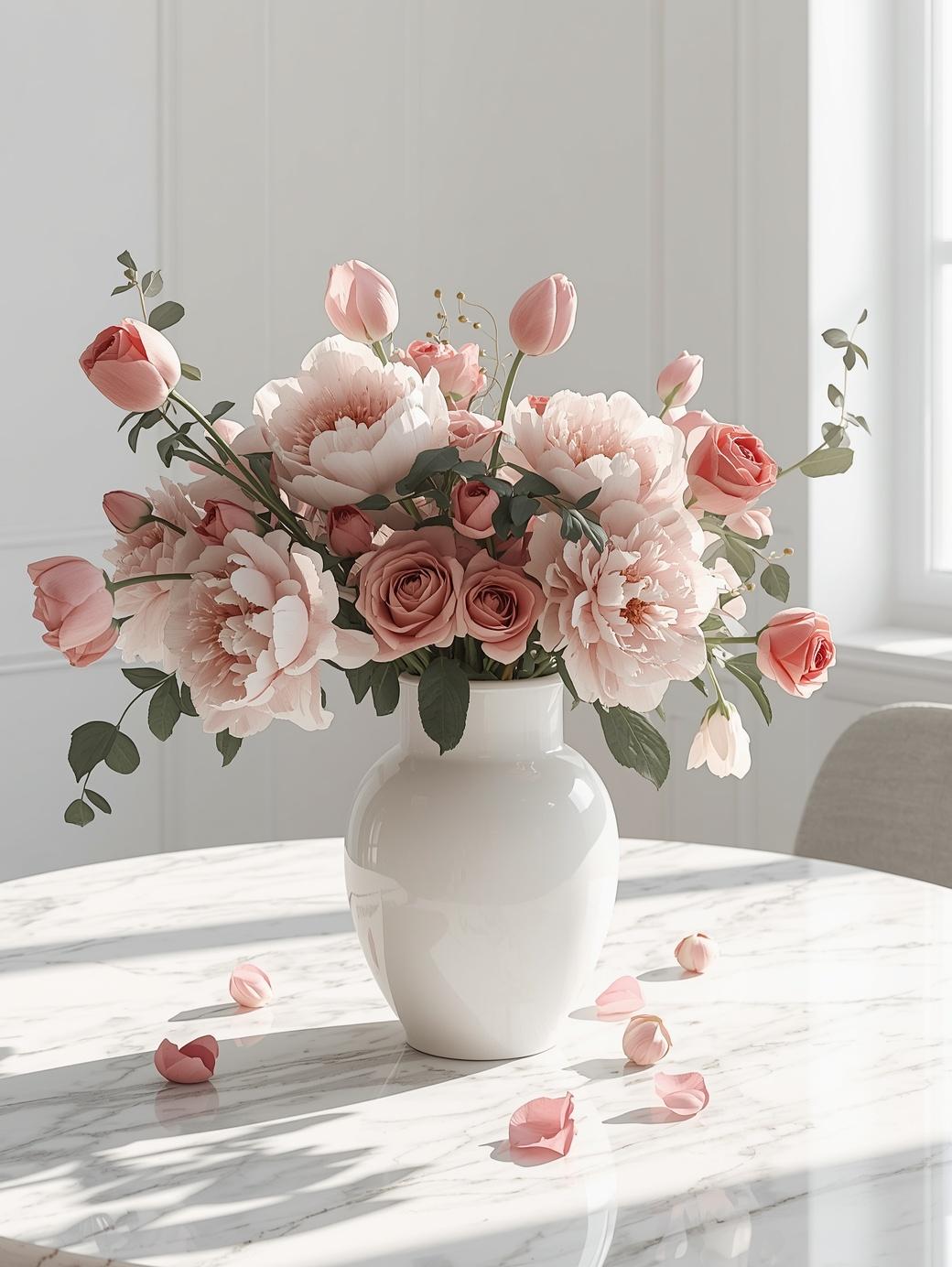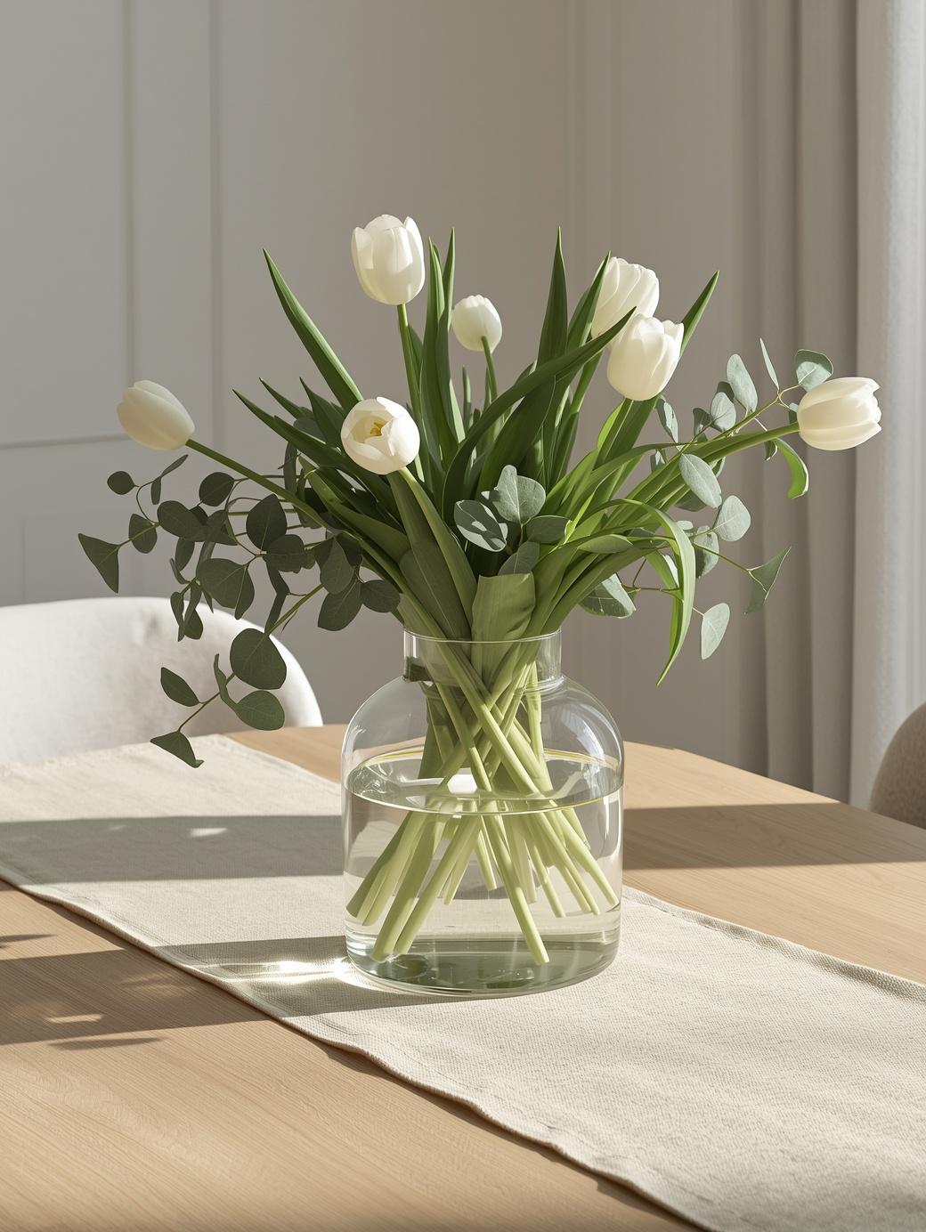 Sometimes the simplest arrangements are the most elegant. A bunch of white tulips, white peonies, or white ranunculus placed in a clear glass vase looks clean, fresh, and timeless. Trim the stems at different lengths so the flowers sit at varying heights. Add a few green leaves for contrast. This classic flower centerpiece works on any table in any room and never goes out of style no matter the season.