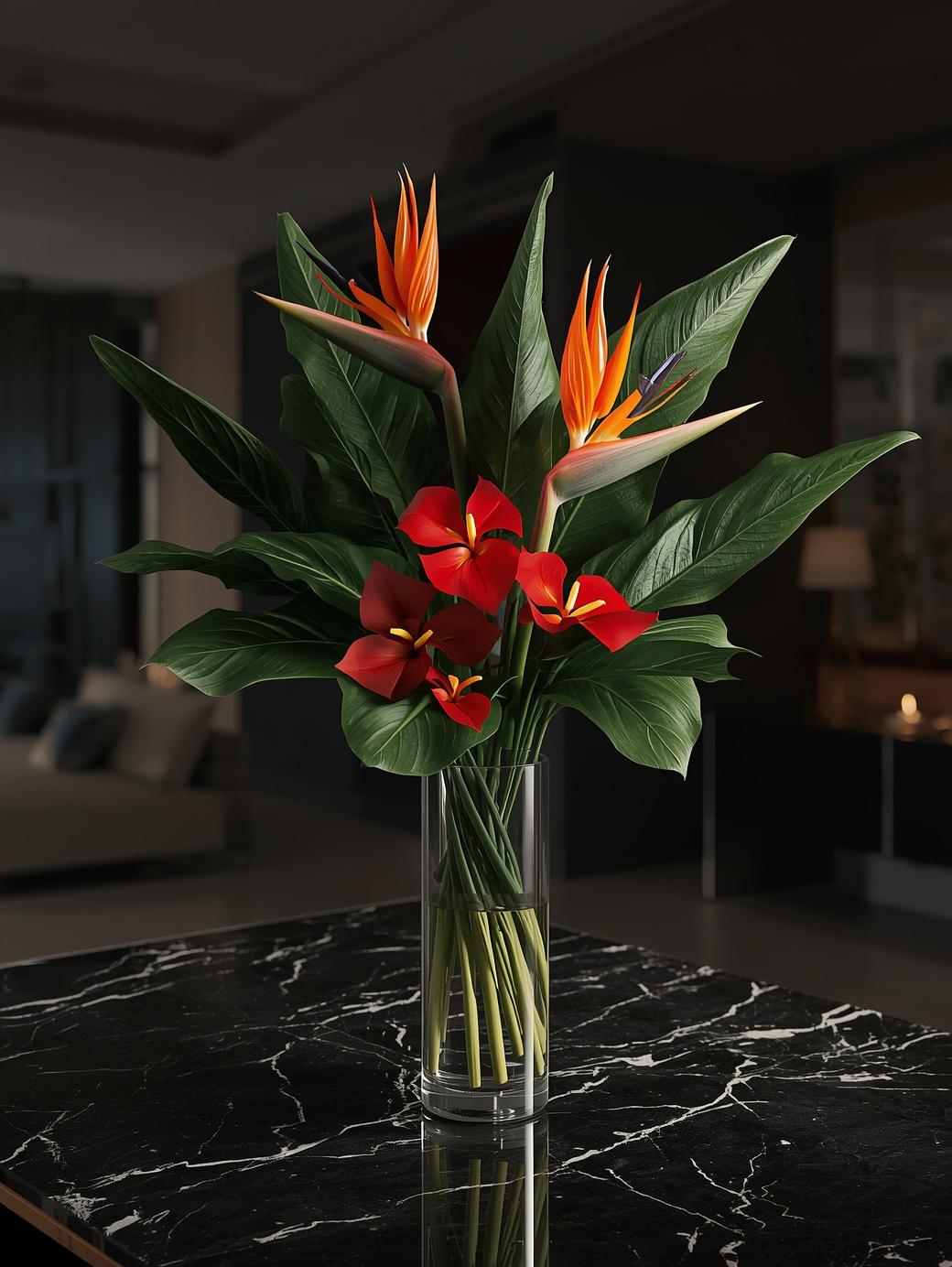 For a more dramatic and modern centerpiece, combine large tropical leaves like monstera or banana leaf with bold, colorful blooms such as birds of paradise, anthuriums, or bright gerbera daisies. Place them in a tall cylindrical vase. The contrast of the large green leaves against the vibrant flowers creates a striking, editorial look. This type of flower centerpiece works especially well in modern, eclectic, or maximalist home interiors.