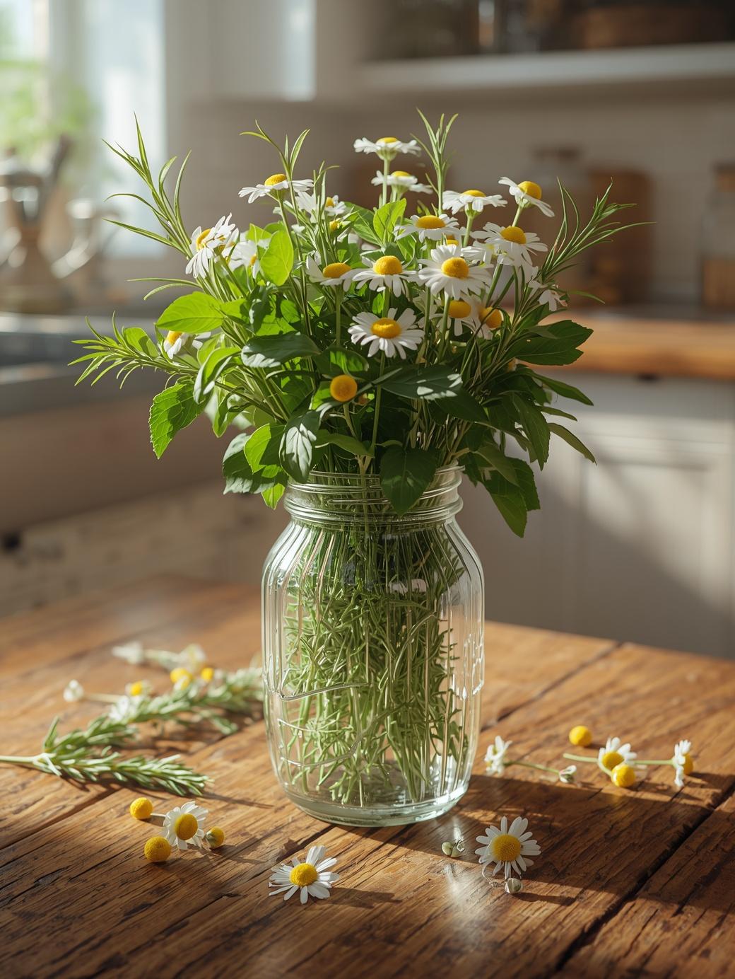Mixing fresh herbs with flowers creates a centerpiece that is both beautiful and wonderfully fragrant. Combine rosemary sprigs, mint stems, and basil leaves with simple flowers like white daisies, chamomile, or small yellow button flowers. The green tones of the herbs make the flowers stand out beautifully. Place the arrangement in a simple clear glass or terracotta pot. This is one of the most unique and sensory flower centerpiece ideas for a kitchen or dining table.