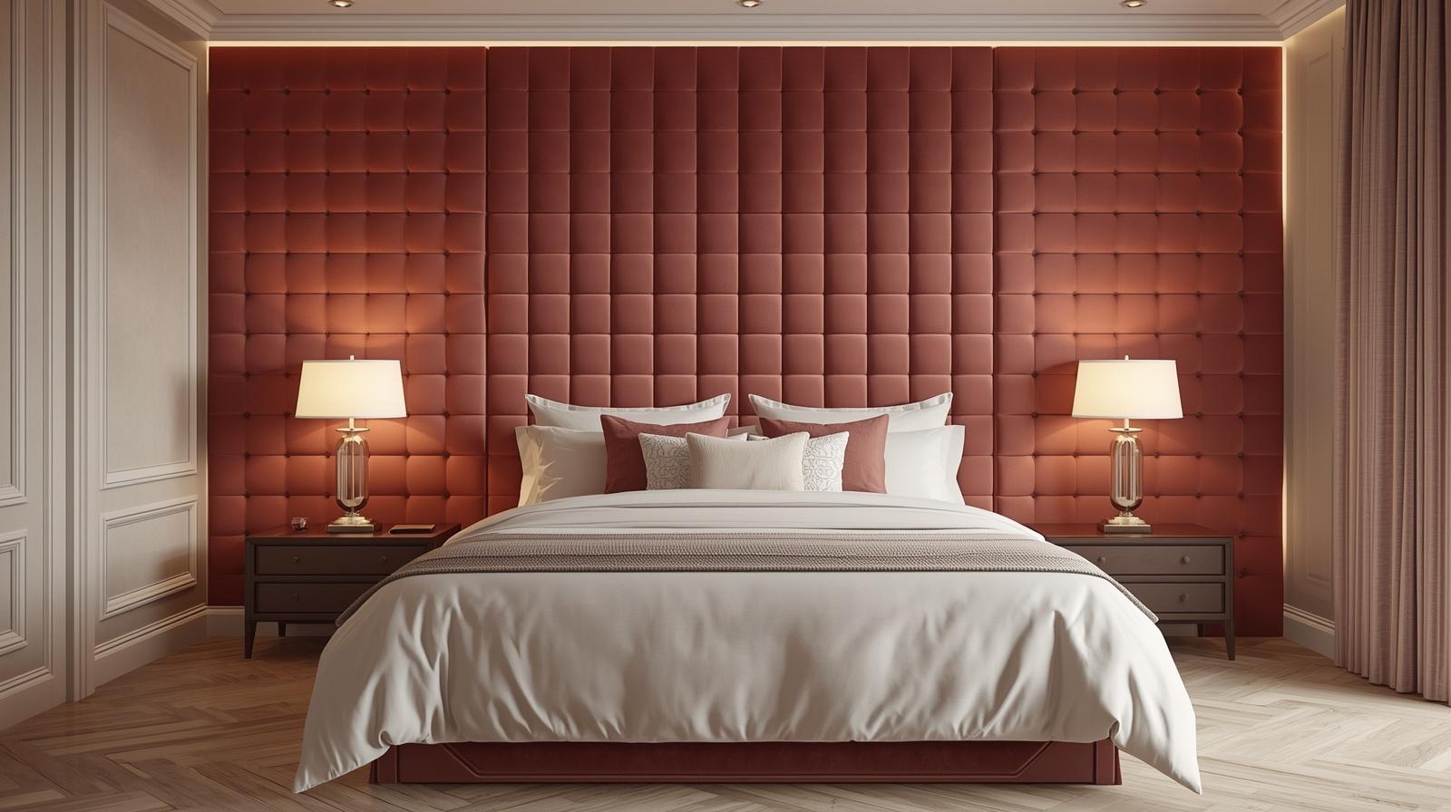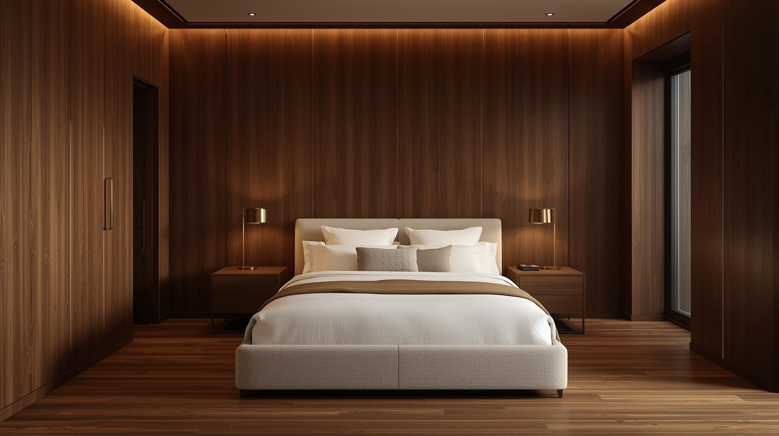 Lining the master bedroom walls in warm walnut wood panelling, whether full height panels running floor to ceiling or a sophisticated dado height treatment with contrasting paint above, creates an interior of extraordinary depth, warmth, and material richness that feels simultaneously like a private gentleman’s library, a luxury boutique hotel suite, and a deeply personal sanctuary of considered, enduring design. The deep grain and warm reddish brown tones of walnut create a cocoon of organic warmth around the sleeping space that is both visually magnificent and profoundly comforting at a sensory level.