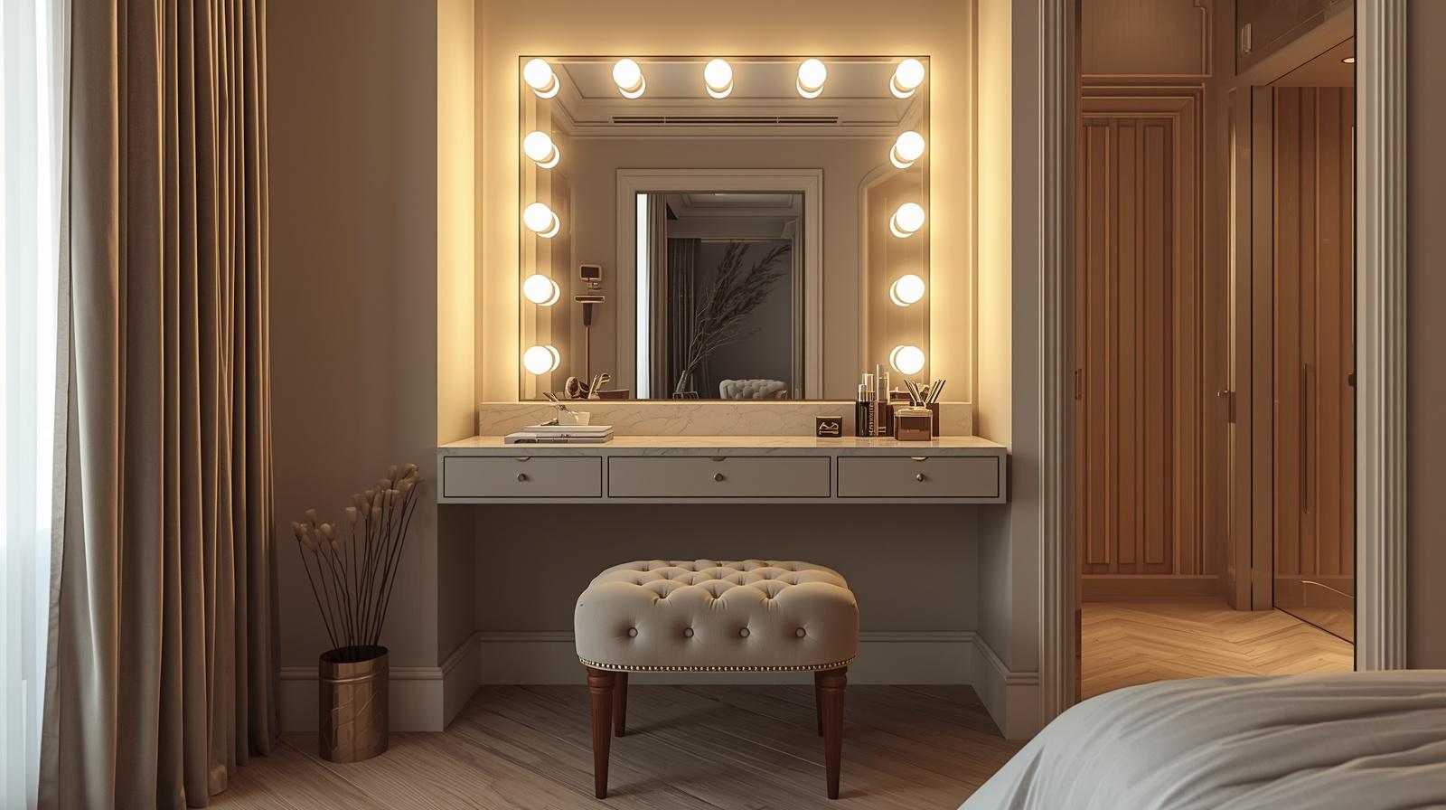 A dedicated dressing area within or directly adjacent to the master bedroom, furnished with a beautifully lit vanity table, an illuminated Hollywood mirror, a comfortable upholstered stool, and thoughtful surface organisation, elevates the daily ritual of preparation into a private, indulgent experience of considerable pleasure. Choose a vanity table in painted lacquer, marble topped brass, or natural wood and surround the mirror with warm bulb lighting that flatters at every angle. The dressing area communicates a quality of domestic luxury that speaks directly and eloquently to the art of considered, unhurried self care.