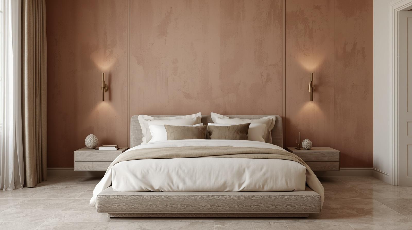 A limewash or Venetian plaster feature wall behind the master bedroom bed creates a surface of extraordinary tactile depth, tonal complexity, and artisanal beauty that provides the most sophisticated and quietly luxurious bedroom backdrop available. The characteristic layered translucency of limewash plaster, where multiple tinted layers of lime are applied and burnished to reveal glimpses of each layer beneath, creates a surface that appears to glow from within with warm, shifting light. Choose warm tones of dusty rose, aged terracotta, warm clay, or deep sage for a feature wall of complete, memorable beauty.