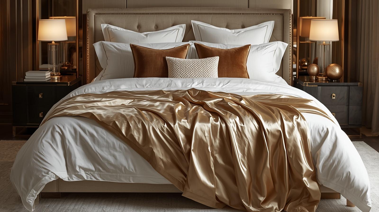 A carefully chosen silk or satin throw draped across the foot of the master bedroom bed adds a final, decisive layer of tactile luxury and visual richness to the bed styling that elevates the entire composition from beautiful to genuinely opulent. Choose a throw in deep champagne gold, rich ivory, midnight navy, or soft blush silk that contrasts or complements the primary bedding palette with considered elegance. The natural sheen of silk catches the ambient bedroom lighting and creates a pool of warm, shifting luster at the foot of the bed that signals luxury with understated, confident sophistication.