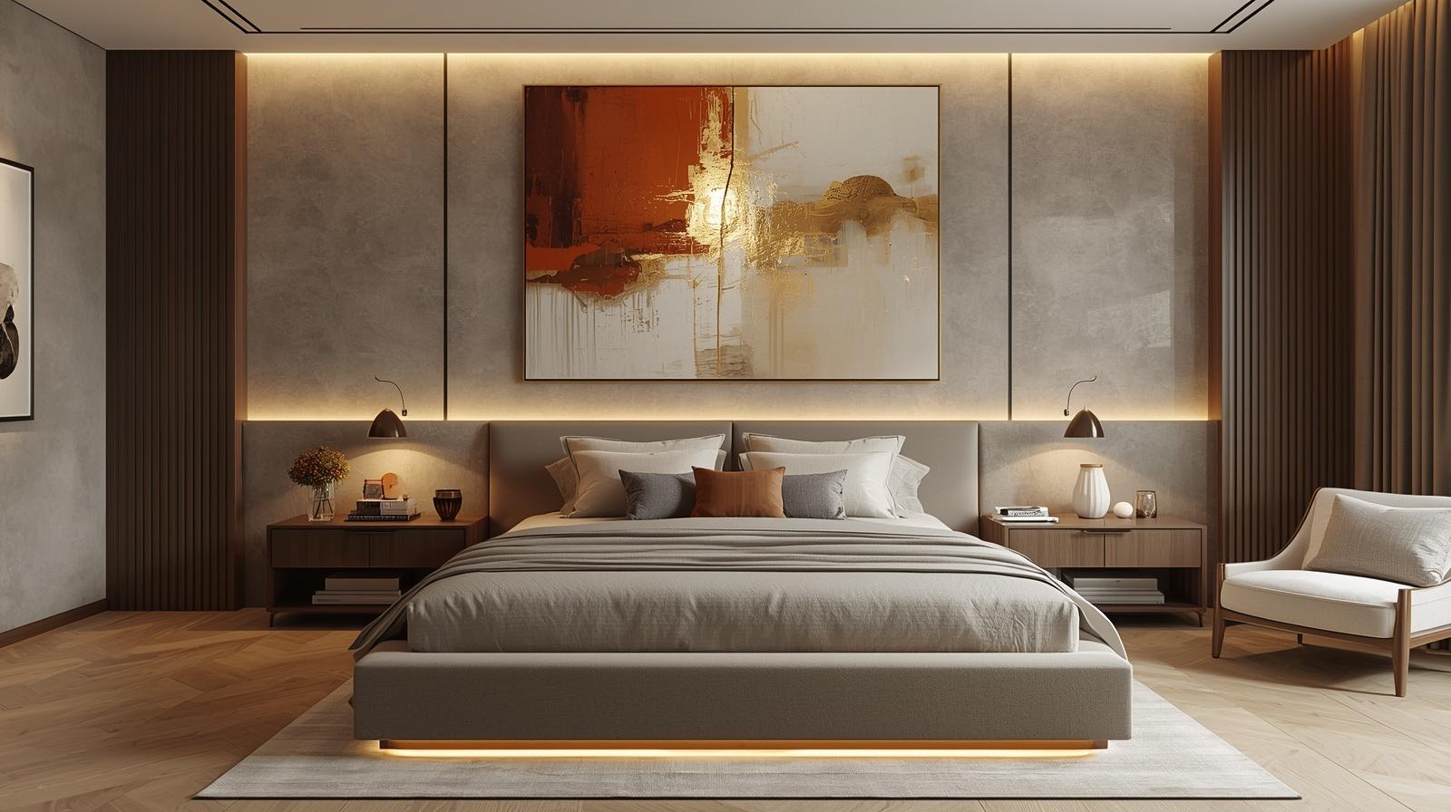 Hanging a single artwork of genuinely generous scale, large enough to span a significant proportion of the wall above the bed, creates a master bedroom composition of gallery quality confidence that elevates the room from a beautifully furnished sleeping space to a genuinely curated interior of artistic ambition and personal expression. Choose an original artwork, a high quality art print, or a commission that speaks directly to the aesthetic and emotional character of the room. The artwork should feel chosen with personal conviction rather than selected for generic decorative appeal.
