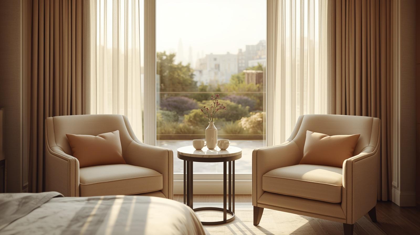 A dedicated morning coffee corner positioned beside the master bedroom window, a small marble topped table, two beautifully upholstered chairs, and a slim sideboard holding a quiet coffee station, creates a private, intimate daily ritual space of extraordinary domestic luxury. The morning light falling across a beautifully set coffee table with ceramic cups, a small vase of flowers, and the view of the garden or cityscape beyond transforms the first quiet moments of the day into a genuinely pleasurable and considered experience that speaks to the highest aspirations of residential luxury living.