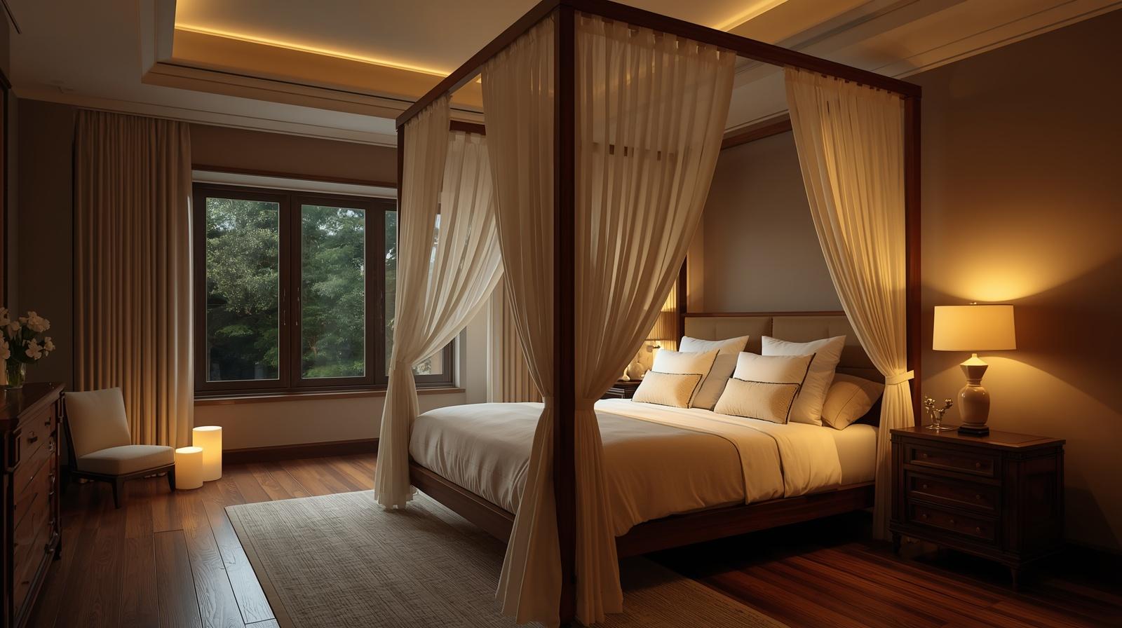 A grand canopy bed with four tall posts and flowing fabric drapes suspended from a ceiling mounted frame creates a master bedroom sleeping environment of theatrical, palatial romance that references centuries of aristocratic bedroom design with complete, unapologetic confidence. Choose drapes in sheer silk organza, lightweight linen voile, or heavyweight velvet depending on the desired atmosphere — ethereal and dreamlike, relaxed and organic, or richly formal and opulent. The canopy creates a private, sheltered sleeping sanctuary within the larger bedroom space, defining a room within a room of extraordinary intimacy and beauty.