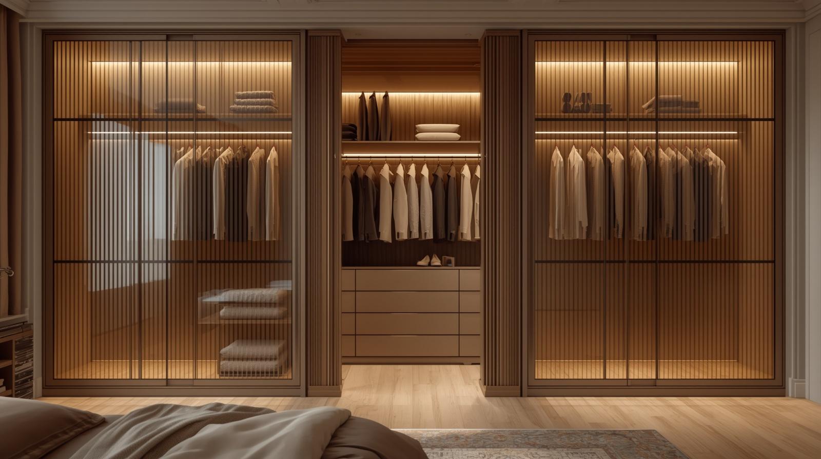 A wall of bespoke floor to ceiling built in wardrobes with integrated internal LED lighting, mirrored interiors, and beautifully detailed door fronts transforms the master bedroom storage wall into a design feature of considerable architectural sophistication. Choose door fronts in fluted glass, cane webbing panels, lacquered wood, or deeply grained veneer to create a wardrobe wall with genuine surface interest and material quality. When the doors are open and the internal lighting illuminates the organised interior, the effect is of a luxury boutique dressing room that elevates the daily ritual of dressing into something genuinely pleasurable and considered.