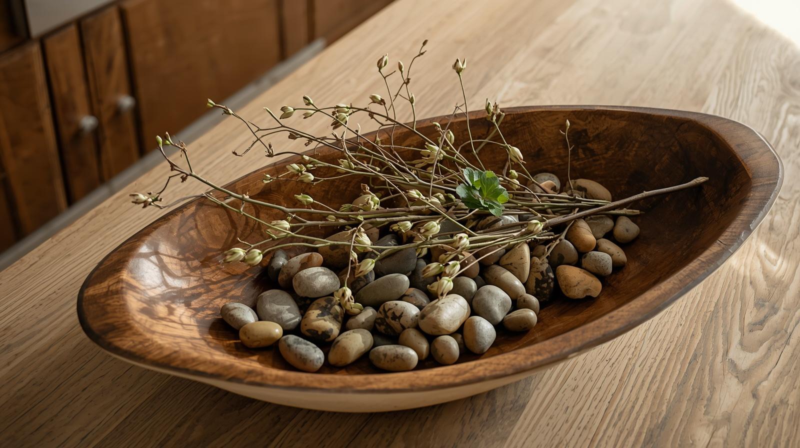 Head outside and collect what nature offers — pinecones giving way to green buds, smooth pebbles, a few clover stems, or dried seed pods. Arrange them loosely in a wide shallow wooden bowl on your coffee table or kitchen island. This free, foraged centerpiece is earthy, unpretentious, and deeply connected to the actual season happening outside your door.