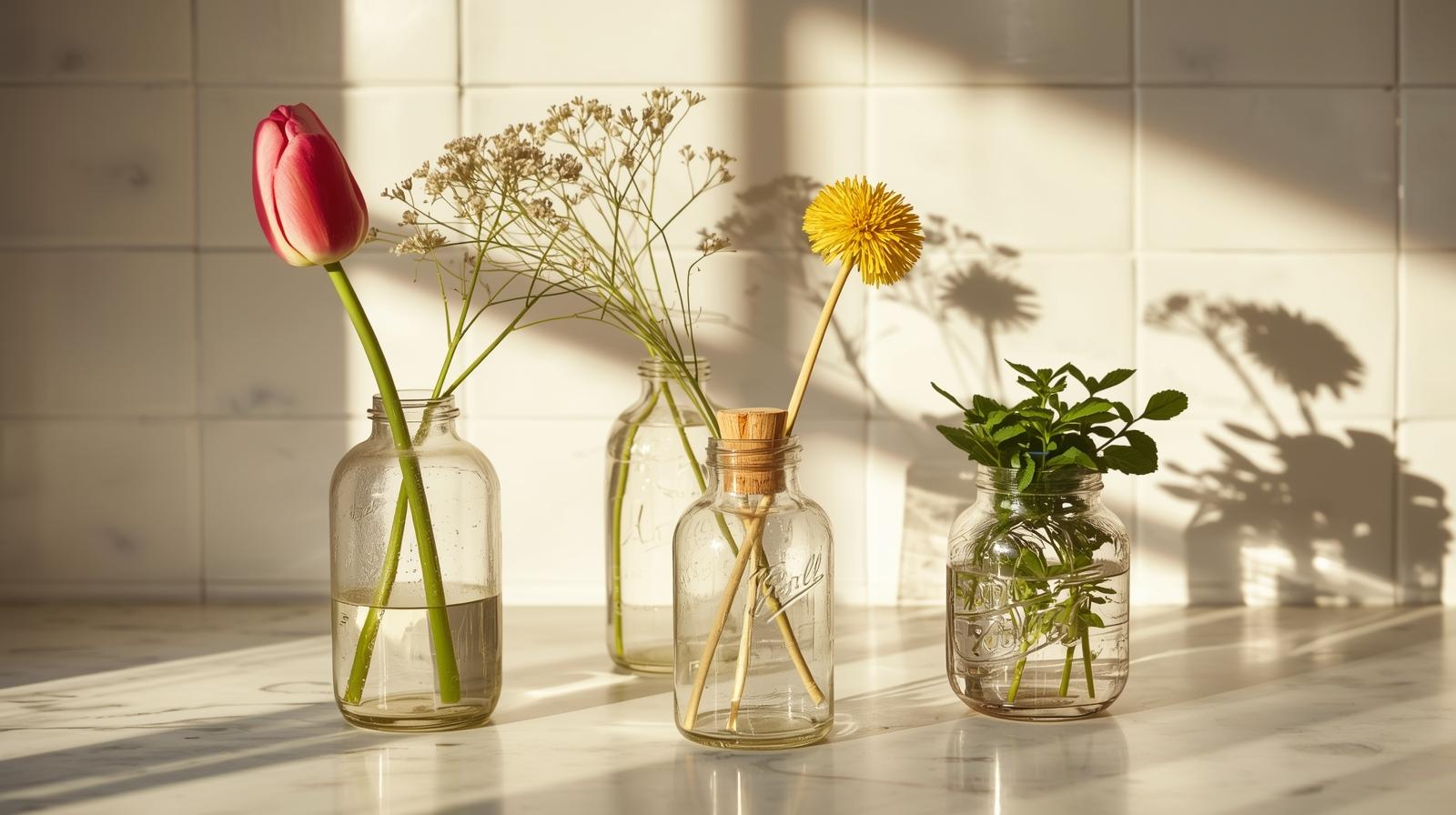 Don’t buy expensive vases — repurpose old jam jars, pasta sauce bottles, or vintage glass containers. Cluster three or four in varying heights on a shelf, kitchen counter, or bathroom ledge. Fill each with a single stem: a tulip, a sprig of baby’s breath, a dandelion, or fresh herbs. The mismatched glass grouping feels collected, personal, and beautifully unpretentious.