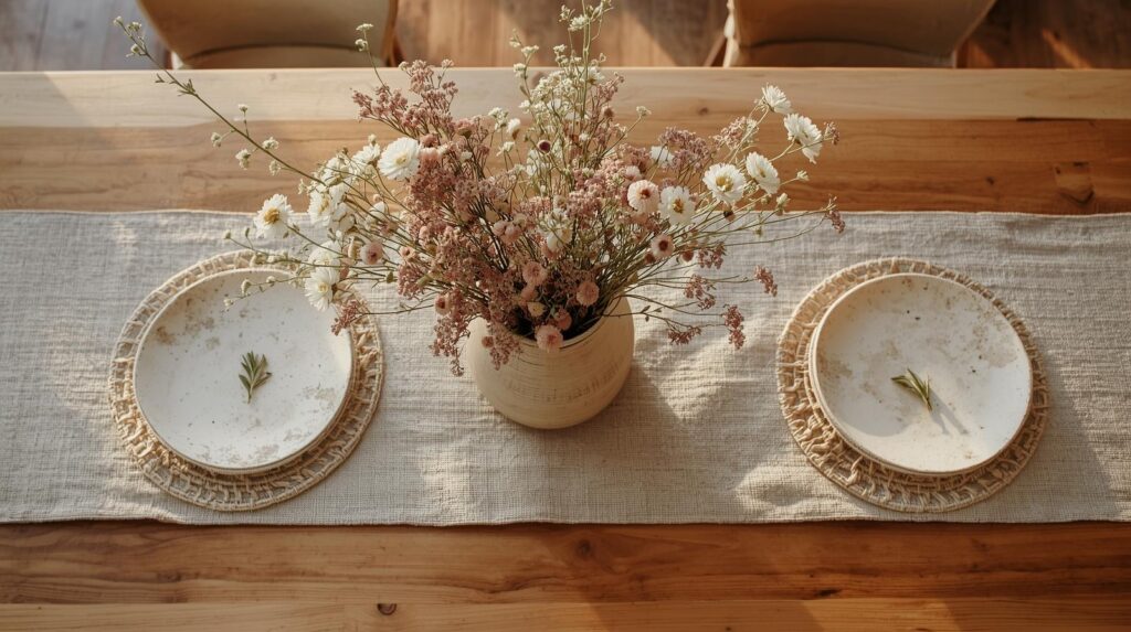 A spring table setting doesn’t need a full tablescape — just intentional details. Use a linen runner in natural or sage, set out a low centerpiece of mixed wildflowers in a short ceramic vase, swap placemats for woven ones, and add a small sprig of rosemary or mint on each plate as a natural place marker. Everyday meals become a seasonal ritual.