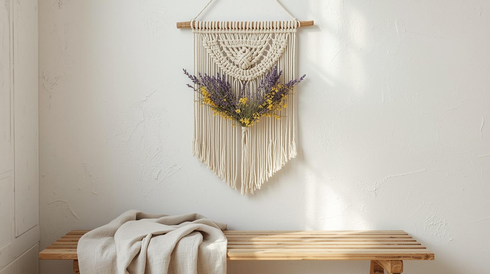 Macramé brings texture and handmade warmth to walls. For spring, weave in or tuck small dried flowers — lavender, strawflowers, or chamomile — into the knots for a seasonal twist. This transforms a neutral fiber art piece into something that feels garden-inspired and alive. It works beautifully in bedrooms, entryways, or above a reading nook.