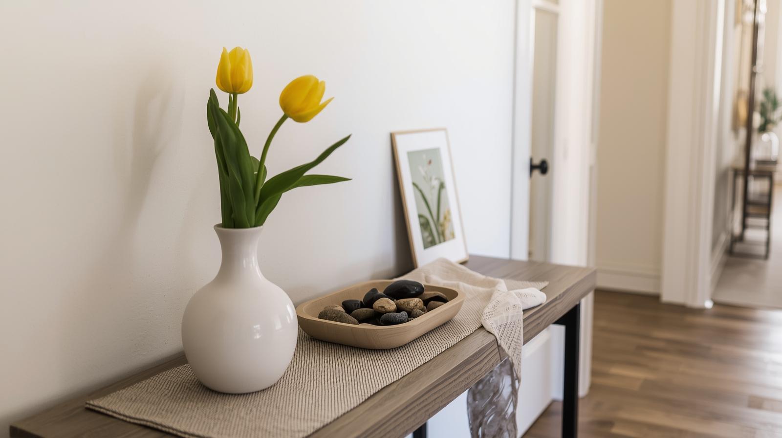 Your entryway sets the tone for the whole home. For spring, style a small console table with a ceramic bowl of smooth stones, a single bud vase with a tulip or daffodil, and a linen runner. Add a hand-lettered or printed botanical art card propped against the wall. This tiny curated moment signals seasonal intentionality the moment anyone walks in.