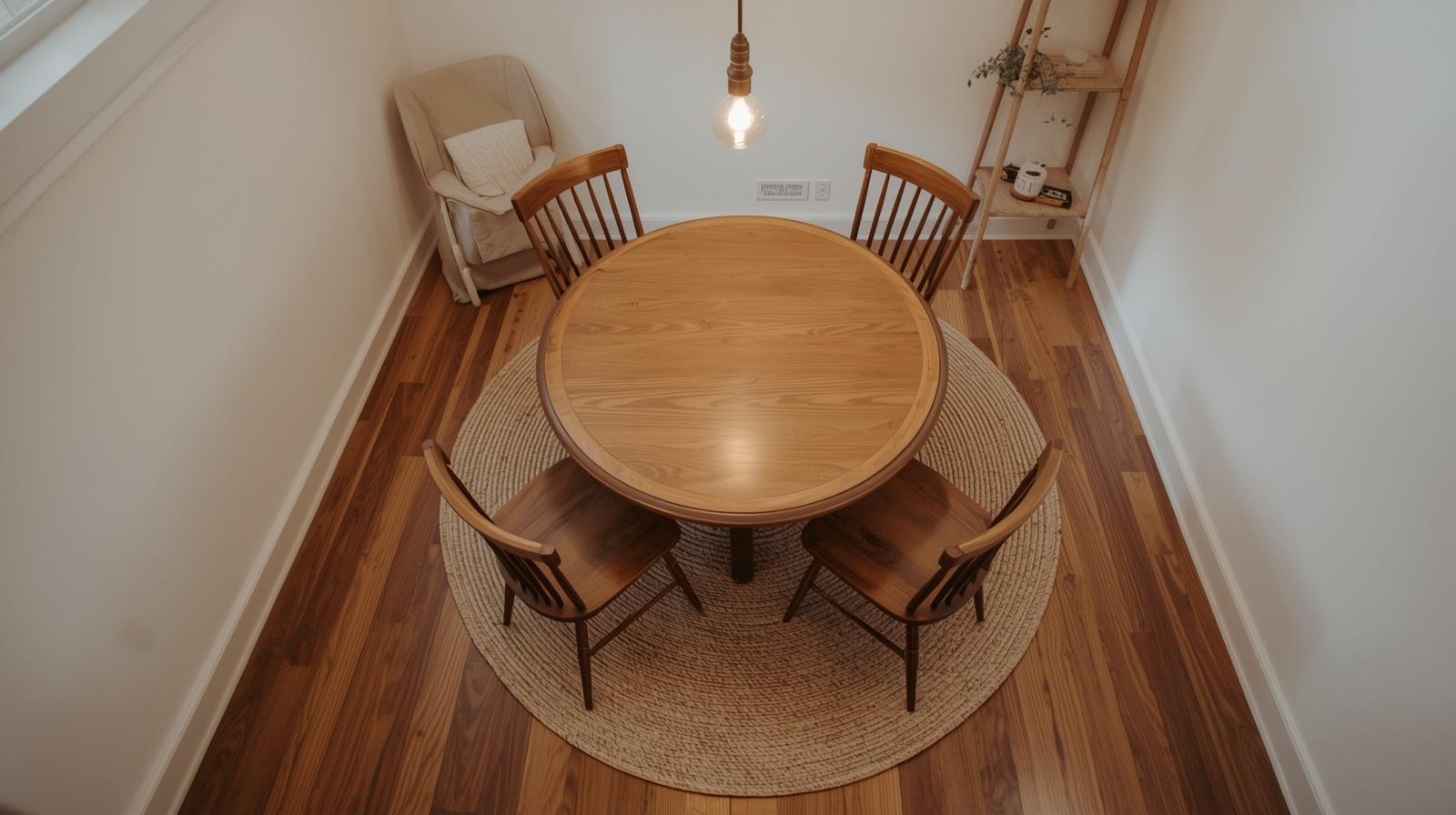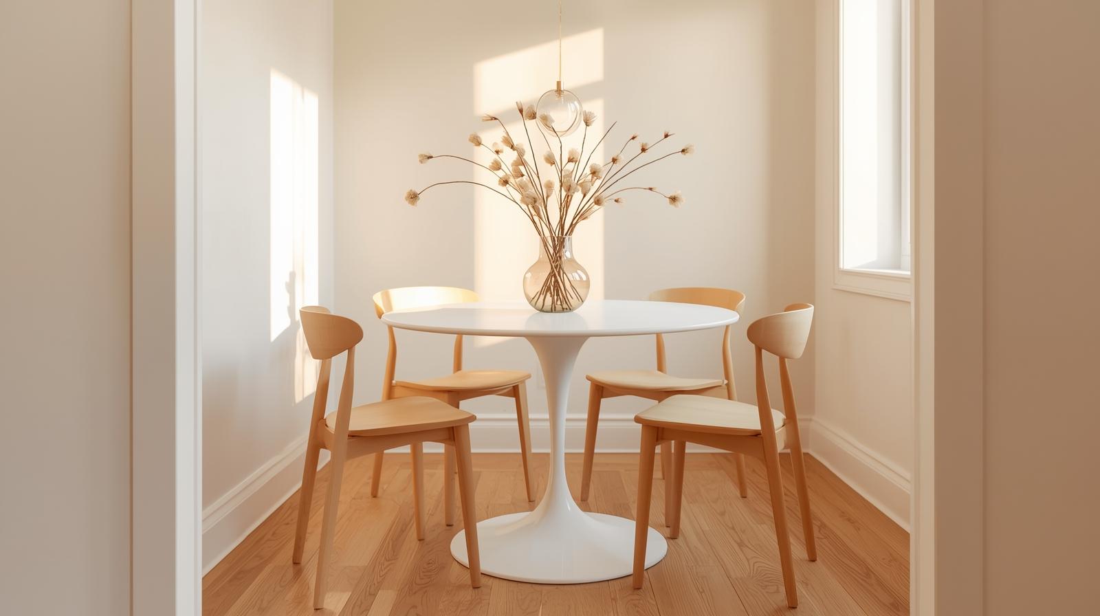 Round tables are the single best furniture choice for small dining rooms. Without sharp corners, they allow easier movement around the space and seat more people comfortably. A pedestal base keeps the floor visually open, making the room feel less crowded. Choose a light wood or white finish to keep things airy and unobtrusive in a compact dining area.