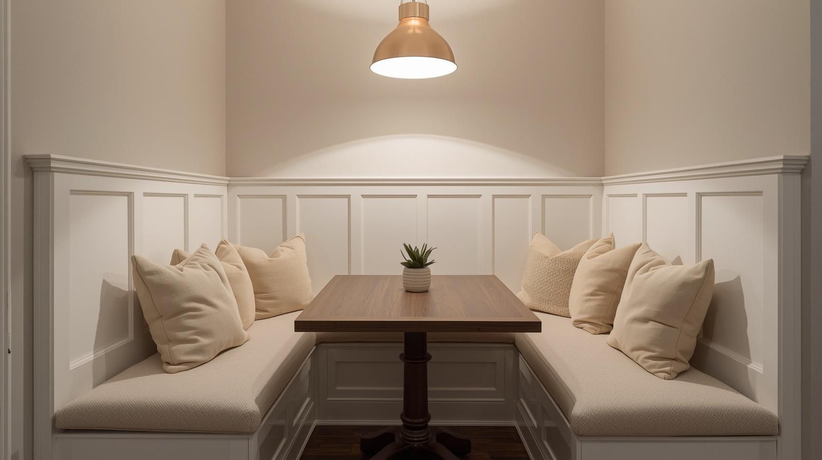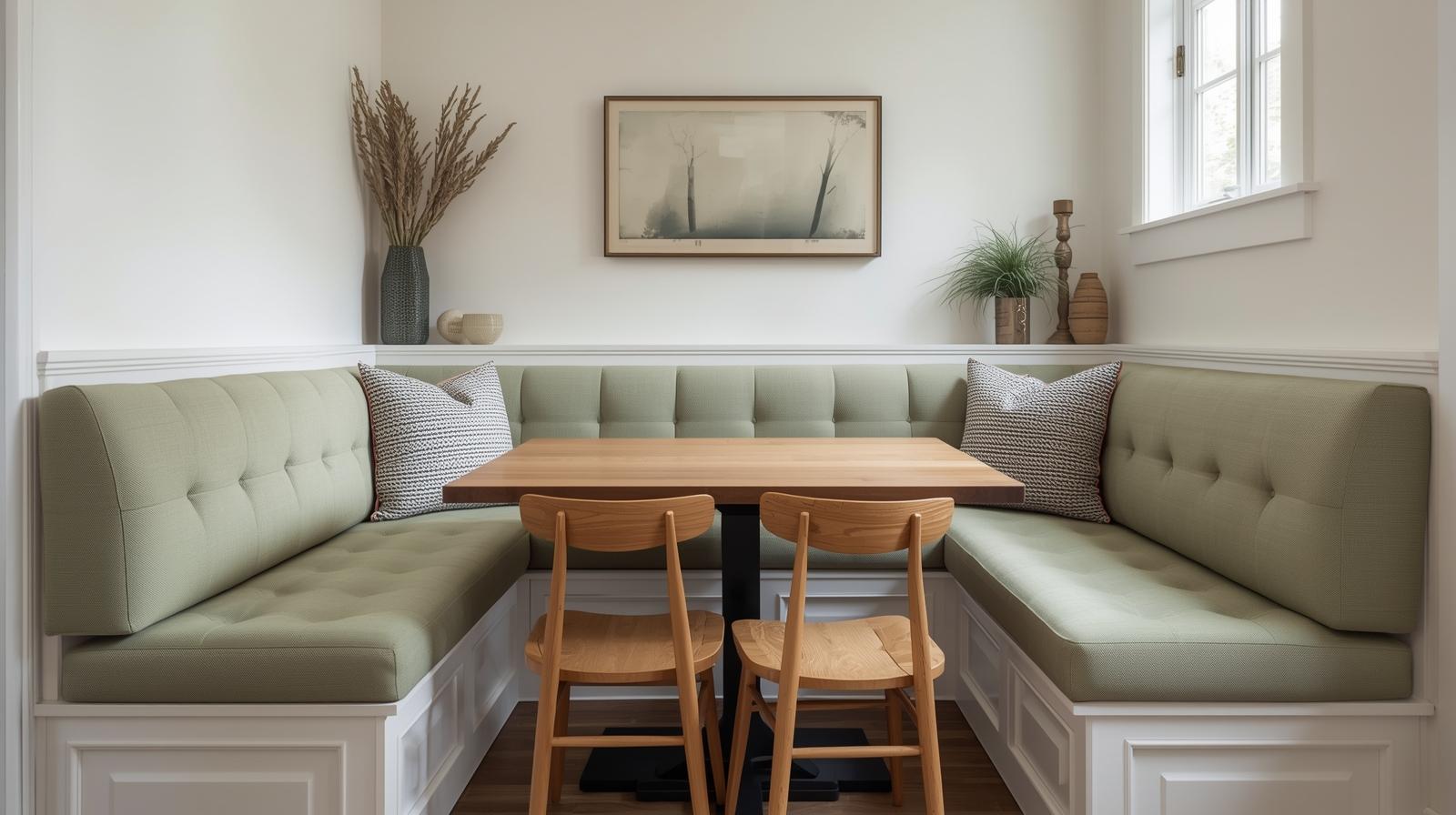 A corner dining nook turns an underused corner into the most charming spot in the home. L-shaped bench seating built or placed into a corner with a small table creates an efficient, cozy dining setup that uses space no standard dining set could occupy. Style with layered cushions, a small hanging light above, and a tiny plant for a café-corner feel.