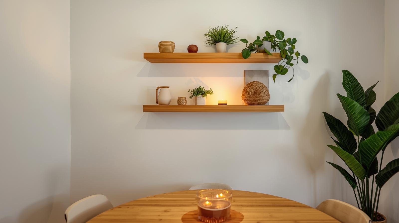 In a small dining room, floor space is precious — so go vertical. Floating wall shelves above the dining table or along one wall serve double duty as storage and decor display. Style them with small plants, candles, and a few decorative objects to add personality. This draws the eye upward, making ceilings feel higher and the room feel more spacious overall.