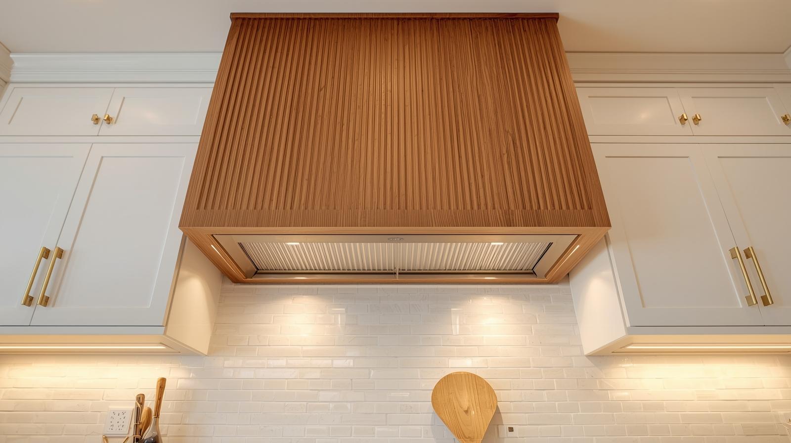 Fluted panels — vertical grooves carved or routed into wood — are trending heavily in modern interior design. Applied to a vent hood cover, they add rich texture and a sense of refined craftsmanship. Natural oak or walnut fluting against white cabinets looks stunning and contemporary. This style requires basic routing skills but delivers a truly high-end designer result.