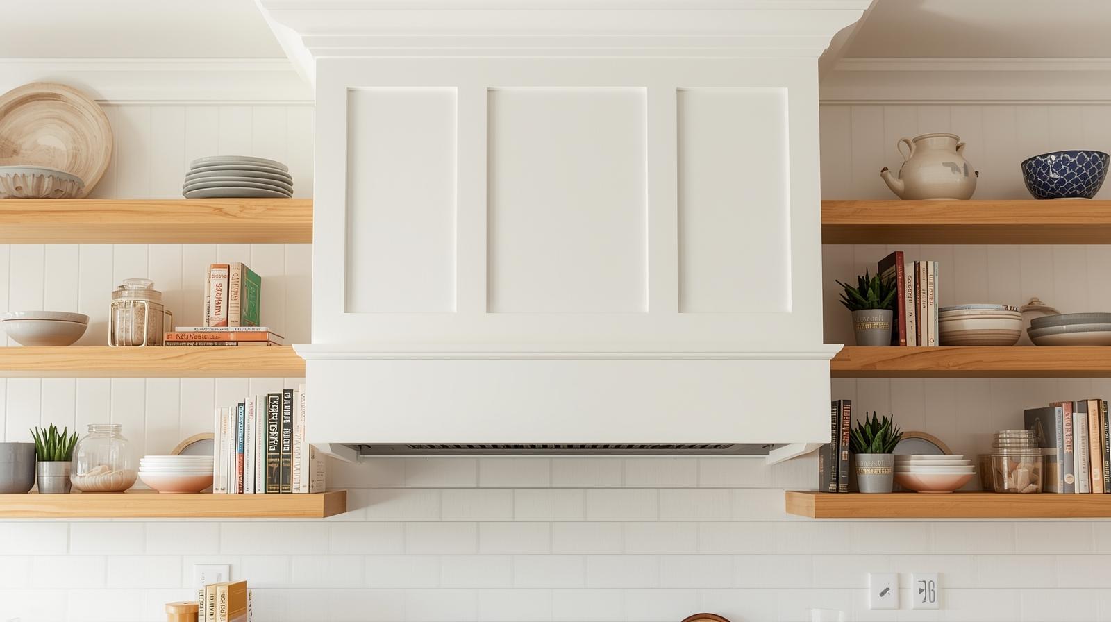 Combining a vent hood cover with open shelving on each side creates a functional and beautiful kitchen feature wall. The shelves can hold cookbooks, ceramics, or plants, turning a purely functional area into a styled display. Use the same wood tone for the hood cover and the shelves to create a cohesive custom-built-in appearance throughout the space.