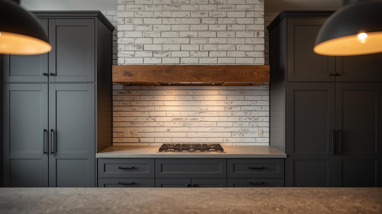 Faux brick or actual thin brick veneer applied to a vent hood cover adds incredible urban industrial texture. Painted white or left in natural red-orange tones, the brick adds dimension and raw material contrast against smooth cabinets. This look suits industrial loft kitchens perfectly but also works in transitional spaces where you want one bold textural statement.