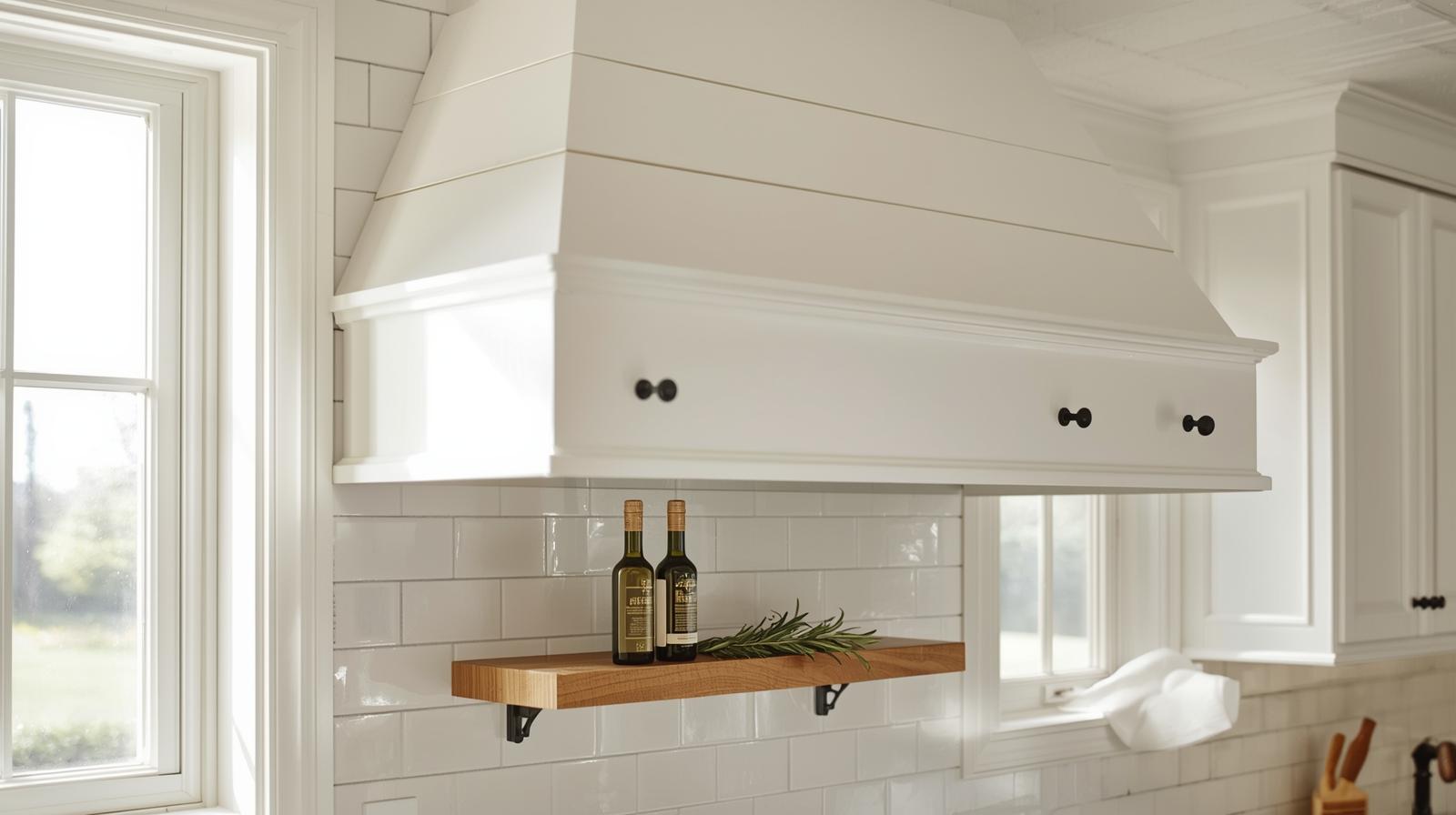 A white shaker vent hood cover that perfectly matches surrounding shaker cabinets creates a polished, seamless kitchen look. The recessed center panel of the shaker style adds just enough visual detail without competing with other design elements. This is the most universally flattering DIY vent hood style and works in virtually every kitchen layout and design aesthetic.