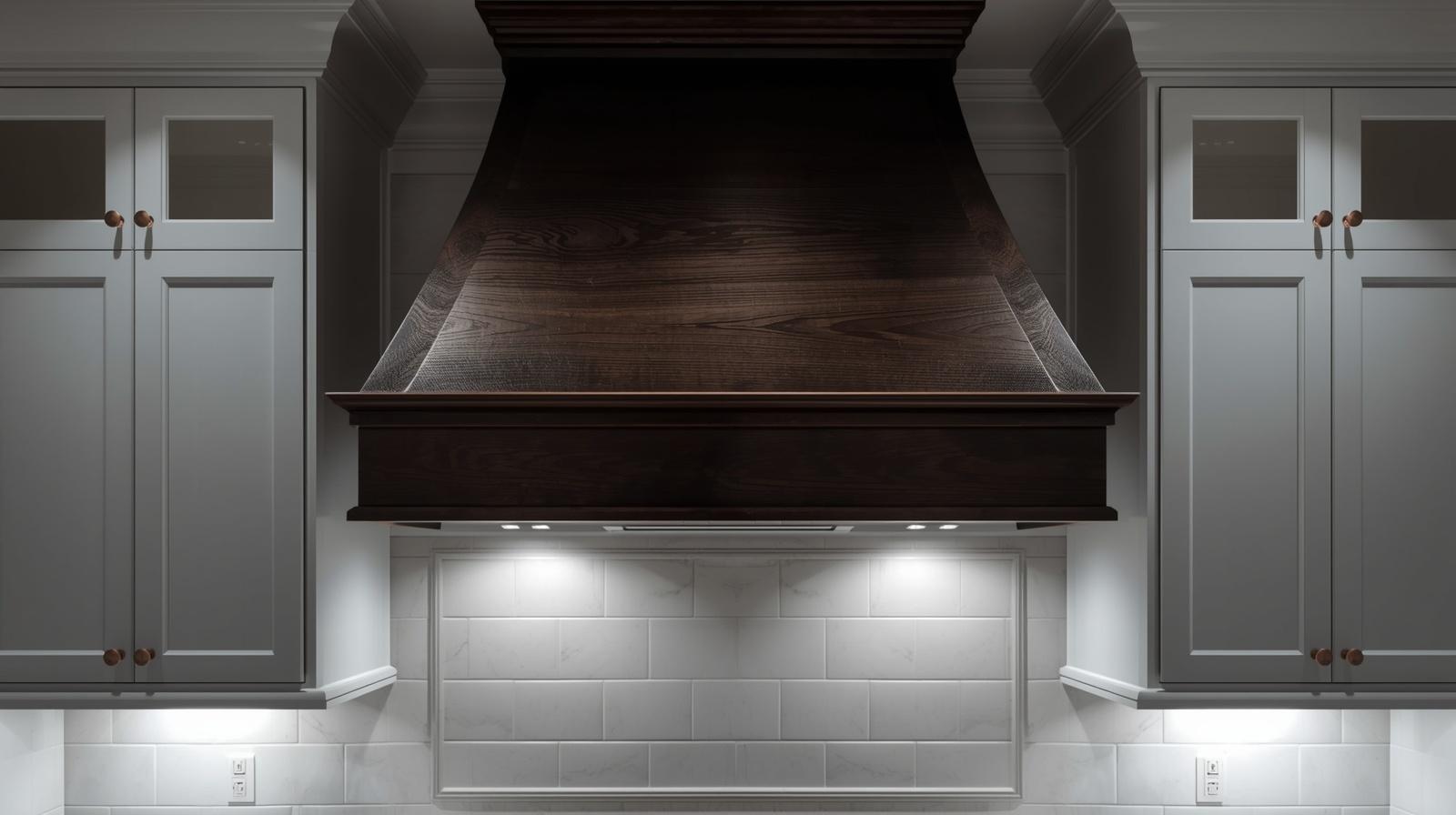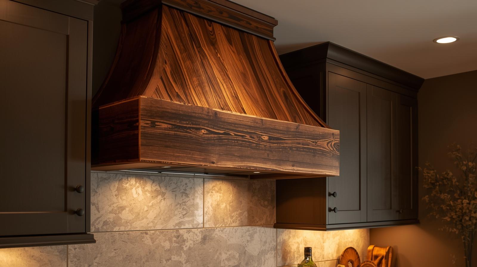 A dark espresso or ebony-stained vent hood cover creates dramatic moody kitchen energy that feels luxurious and editorial. Against white or light grey cabinets, the deep dark wood tone anchors the space powerfully. Add brass or copper hardware throughout to warm up the darkness. This bold design choice makes the kitchen feel like a high-end restaurant rather than a standard home kitchen.