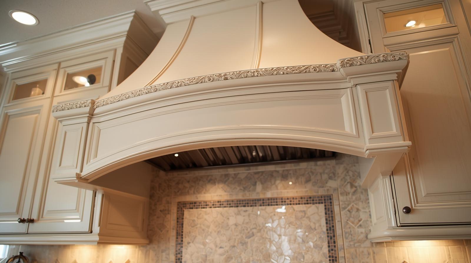 A vent hood with a curved or bell-shaped bottom silhouette is a classic French country design element. The graceful curve contrasts beautifully with the straight lines of surrounding cabinetry. Finished in antique white or pale greige with detailed carved molding, this hood style transforms an ordinary kitchen into a romantically European-inspired cooking space full of timeless elegance.
