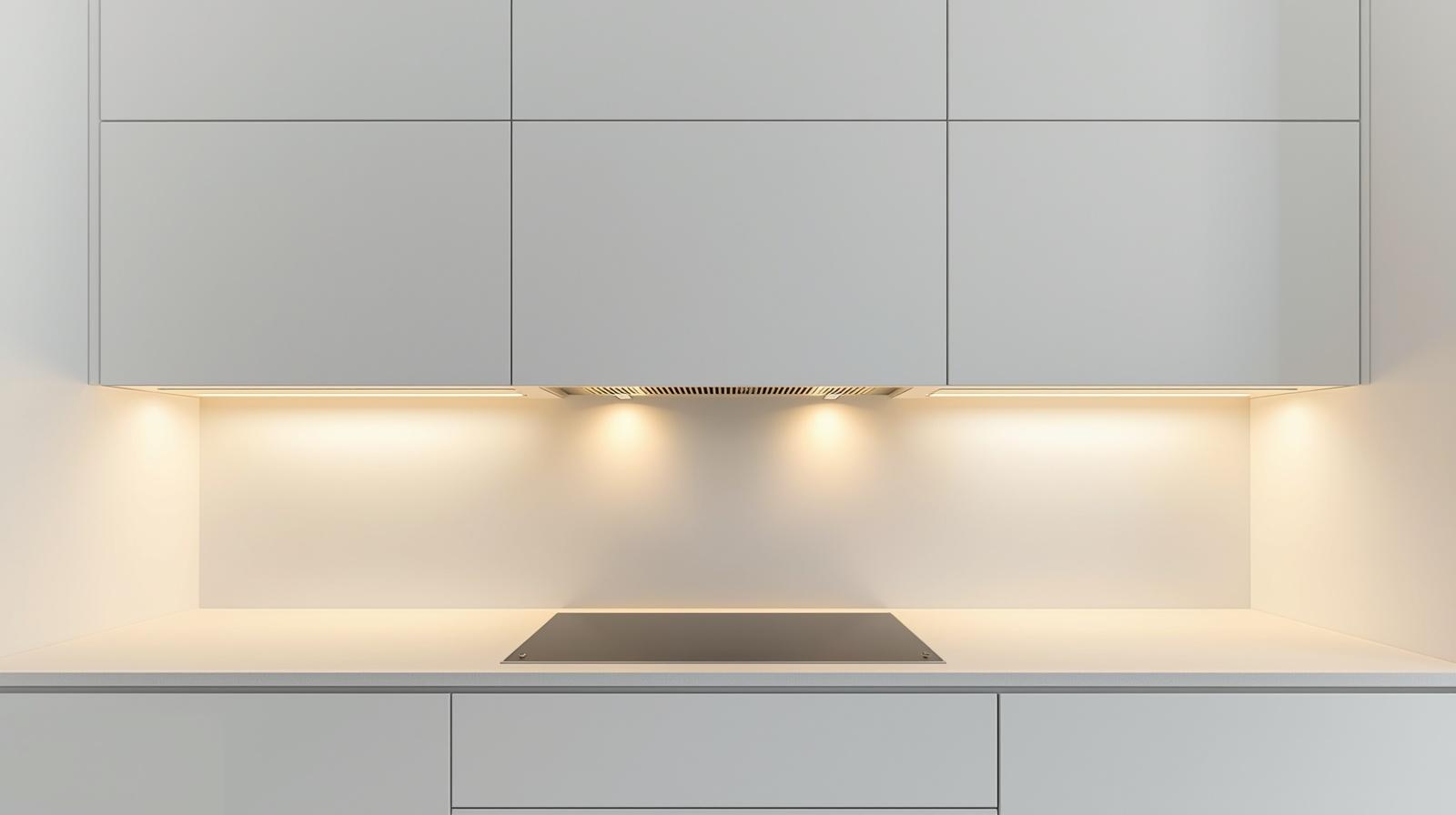 For a sleek, contemporary kitchen, a flat-panel vent hood cover that matches surrounding cabinet doors creates a seamless built-in effect. Use the same cabinet door style and hardware throughout for visual continuity. This approach works especially well with handle-less push-to-open cabinetry, making the entire wall look like one cohesive, designer-made installation.